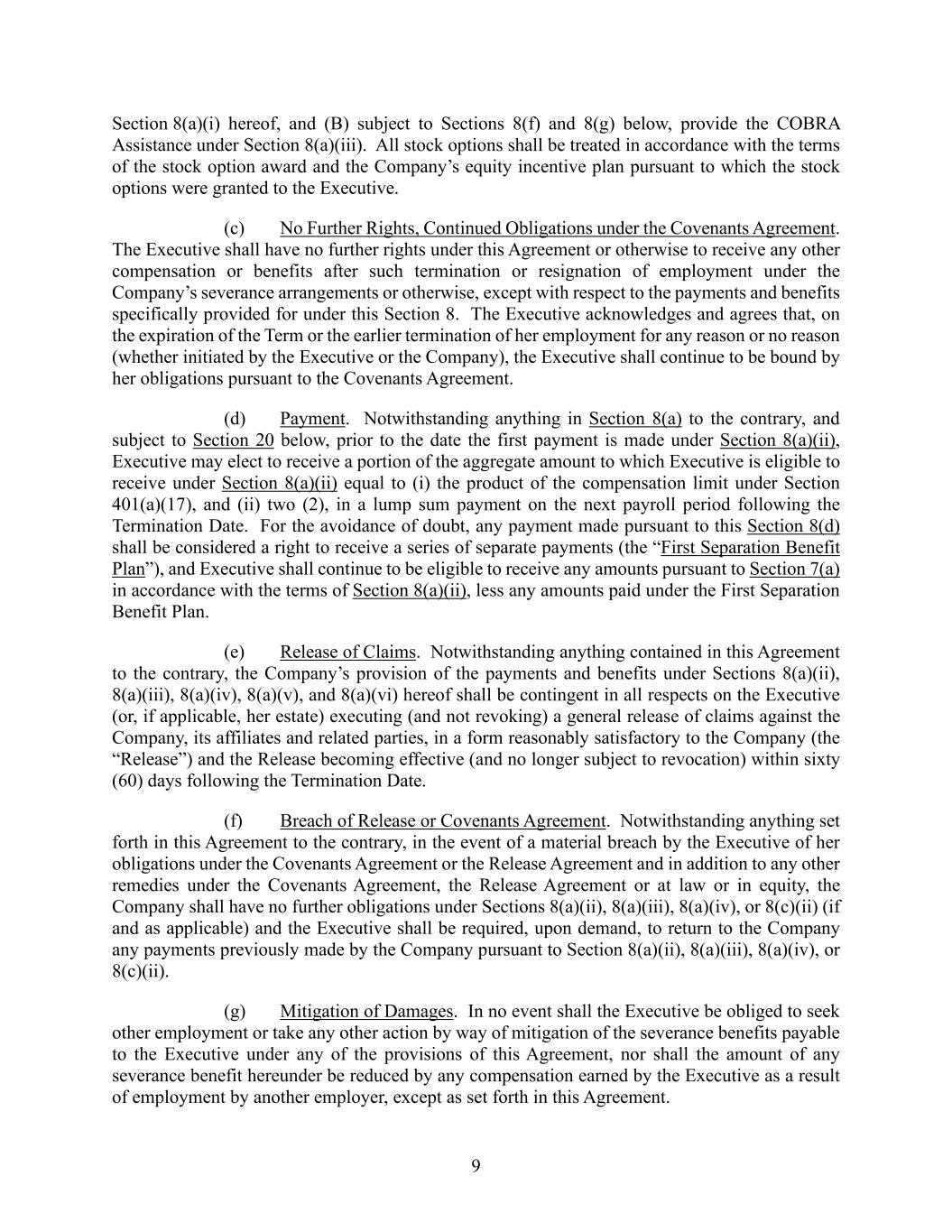 9 Section 8(a)(i) hereof, and (B) subject to Sections 8(f) and 8(g) below, provide the COBRA Assistance under Section 8(a)(iii). All stock options shall be treated in accordance with the terms of the stock option award and the Company’s equity incentive plan pursuant to which the stock options were granted to the Executive. (c) No Further Rights, Continued Obligations under the Covenants Agreement. The Executive shall have no further rights under this Agreement or otherwise to receive any other compensation or benefits after such termination or resignation of employment under the Company’s severance arrangements or otherwise, except with respect to the payments and benefits specifically provided for under this Section 8. The Executive acknowledges and agrees that, on the expiration of the Term or the earlier termination of her employment for any reason or no reason (whether initiated by the Executive or the Company), the Executive shall continue to be bound by her obligations pursuant to the Covenants Agreement. (d) Payment. Notwithstanding anything in Section 8(a) to the contrary, and subject to Section 20 below, prior to the date the first payment is made under Section 8(a)(ii), Executive may elect to receive a portion of the aggregate amount to which Executive is eligible to receive under Section 8(a)(ii) equal to (i) the product of the compensation limit under Section 401(a)(17), and (ii) two (2), in a lump sum payment on the next payroll period following the Termination Date. For the avoidance of doubt, any payment made pursuant to this Section 8(d) shall be considered a right to receive a series of separate payments (the “First Separation Benefit Plan”), and Executive shall continue to be eligible to receive any amounts pursuant to Section 7(a) in accordance with the terms of Section 8(a)(ii), less any amounts paid under the First Separation Benefit Plan. (e) Release of Claims. Notwithstanding anything contained in this Agreement to the contrary, the Company’s provision of the payments and benefits under Sections 8(a)(ii), 8(a)(iii), 8(a)(iv), 8(a)(v), and 8(a)(vi) hereof shall be contingent in all respects on the Executive (or, if applicable, her estate) executing (and not revoking) a general release of claims against the Company, its affiliates and related parties, in a form reasonably satisfactory to the Company (the “Release”) and the Release becoming effective (and no longer subject to revocation) within sixty (60) days following the Termination Date. (f) Breach of Release or Covenants Agreement. Notwithstanding anything set forth in this Agreement to the contrary, in the event of a material breach by the Executive of her obligations under the Covenants Agreement or the Release Agreement and in addition to any other remedies under the Covenants Agreement, the Release Agreement or at law or in equity, the Company shall have no further obligations under Sections 8(a)(ii), 8(a)(iii), 8(a)(iv), or 8(c)(ii) (if and as applicable) and the Executive shall be required, upon demand, to return to the Company any payments previously made by the Company pursuant to Section 8(a)(ii), 8(a)(iii), 8(a)(iv), or 8(c)(ii). (g) Mitigation of Damages. In no event shall the Executive be obliged to seek other employment or take any other action by way of mitigation of the severance benefits payable to the Executive under any of the provisions of this Agreement, nor shall the amount of any severance benefit hereunder be reduced by any compensation earned by the Executive as a result of employment by another employer, except as set forth in this Agreement.
