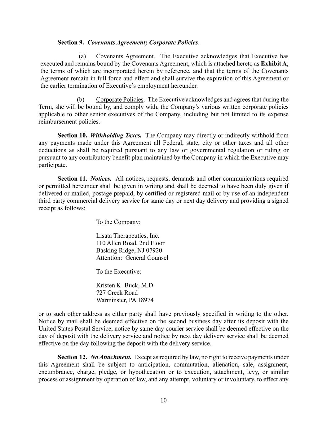 10 Section 9. Covenants Agreement; Corporate Policies. (a) Covenants Agreement. The Executive acknowledges that Executive has executed and remains bound by the Covenants Agreement, which is attached hereto as Exhibit A, the terms of which are incorporated herein by reference, and that the terms of the Covenants Agreement remain in full force and effect and shall survive the expiration of this Agreement or the earlier termination of Executive’s employment hereunder. (b) Corporate Policies. The Executive acknowledges and agrees that during the Term, she will be bound by, and comply with, the Company’s various written corporate policies applicable to other senior executives of the Company, including but not limited to its expense reimbursement policies. Section 10. Withholding Taxes. The Company may directly or indirectly withhold from any payments made under this Agreement all Federal, state, city or other taxes and all other deductions as shall be required pursuant to any law or governmental regulation or ruling or pursuant to any contributory benefit plan maintained by the Company in which the Executive may participate. Section 11. Notices. All notices, requests, demands and other communications required or permitted hereunder shall be given in writing and shall be deemed to have been duly given if delivered or mailed, postage prepaid, by certified or registered mail or by use of an independent third party commercial delivery service for same day or next day delivery and providing a signed receipt as follows: To the Company: Lisata Therapeutics, Inc. 110 Allen Road, 2nd Floor Basking Ridge, NJ 07920 Attention: General Counsel To the Executive: Kristen K. Buck, M.D. 727 Creek Road Warminster, PA 18974 or to such other address as either party shall have previously specified in writing to the other. Notice by mail shall be deemed effective on the second business day after its deposit with the United States Postal Service, notice by same day courier service shall be deemed effective on the day of deposit with the delivery service and notice by next day delivery service shall be deemed effective on the day following the deposit with the delivery service. Section 12. No Attachment. Except as required by law, no right to receive payments under this Agreement shall be subject to anticipation, commutation, alienation, sale, assignment, encumbrance, charge, pledge, or hypothecation or to execution, attachment, levy, or similar process or assignment by operation of law, and any attempt, voluntary or involuntary, to effect any