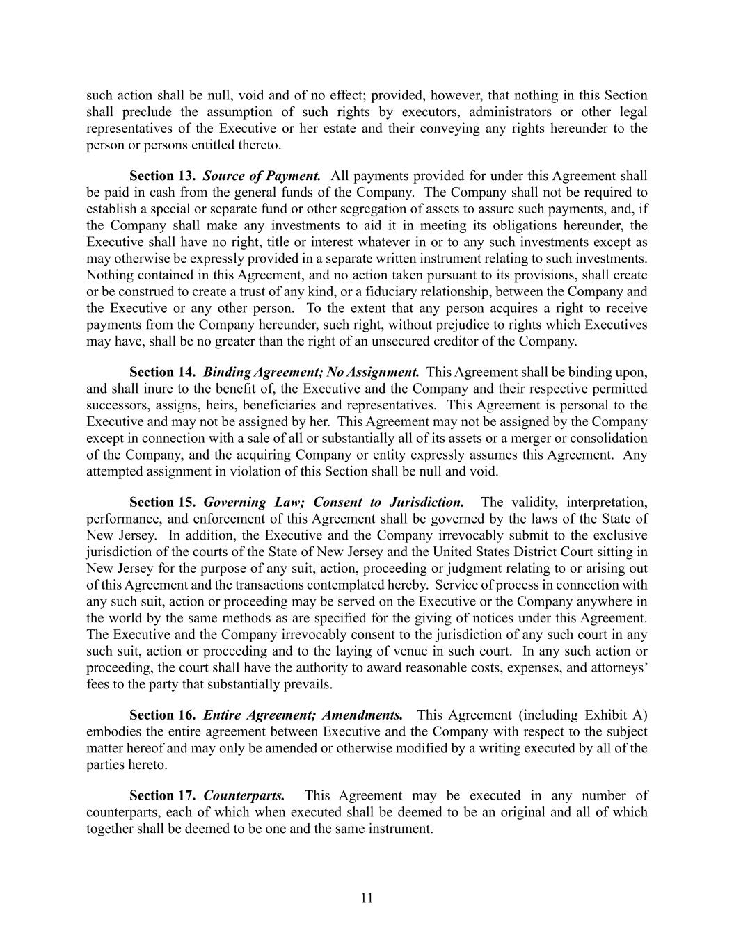 11 such action shall be null, void and of no effect; provided, however, that nothing in this Section shall preclude the assumption of such rights by executors, administrators or other legal representatives of the Executive or her estate and their conveying any rights hereunder to the person or persons entitled thereto. Section 13. Source of Payment. All payments provided for under this Agreement shall be paid in cash from the general funds of the Company. The Company shall not be required to establish a special or separate fund or other segregation of assets to assure such payments, and, if the Company shall make any investments to aid it in meeting its obligations hereunder, the Executive shall have no right, title or interest whatever in or to any such investments except as may otherwise be expressly provided in a separate written instrument relating to such investments. Nothing contained in this Agreement, and no action taken pursuant to its provisions, shall create or be construed to create a trust of any kind, or a fiduciary relationship, between the Company and the Executive or any other person. To the extent that any person acquires a right to receive payments from the Company hereunder, such right, without prejudice to rights which Executives may have, shall be no greater than the right of an unsecured creditor of the Company. Section 14. Binding Agreement; No Assignment. This Agreement shall be binding upon, and shall inure to the benefit of, the Executive and the Company and their respective permitted successors, assigns, heirs, beneficiaries and representatives. This Agreement is personal to the Executive and may not be assigned by her. This Agreement may not be assigned by the Company except in connection with a sale of all or substantially all of its assets or a merger or consolidation of the Company, and the acquiring Company or entity expressly assumes this Agreement. Any attempted assignment in violation of this Section shall be null and void. Section 15. Governing Law; Consent to Jurisdiction. The validity, interpretation, performance, and enforcement of this Agreement shall be governed by the laws of the State of New Jersey. In addition, the Executive and the Company irrevocably submit to the exclusive jurisdiction of the courts of the State of New Jersey and the United States District Court sitting in New Jersey for the purpose of any suit, action, proceeding or judgment relating to or arising out of this Agreement and the transactions contemplated hereby. Service of process in connection with any such suit, action or proceeding may be served on the Executive or the Company anywhere in the world by the same methods as are specified for the giving of notices under this Agreement. The Executive and the Company irrevocably consent to the jurisdiction of any such court in any such suit, action or proceeding and to the laying of venue in such court. In any such action or proceeding, the court shall have the authority to award reasonable costs, expenses, and attorneys’ fees to the party that substantially prevails. Section 16. Entire Agreement; Amendments. This Agreement (including Exhibit A) embodies the entire agreement between Executive and the Company with respect to the subject matter hereof and may only be amended or otherwise modified by a writing executed by all of the parties hereto. Section 17. Counterparts. This Agreement may be executed in any number of counterparts, each of which when executed shall be deemed to be an original and all of which together shall be deemed to be one and the same instrument.