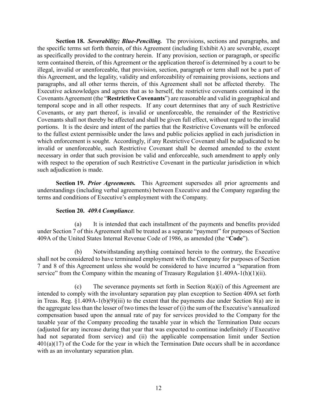 12 Section 18. Severability; Blue-Penciling. The provisions, sections and paragraphs, and the specific terms set forth therein, of this Agreement (including Exhibit A) are severable, except as specifically provided to the contrary herein. If any provision, section or paragraph, or specific term contained therein, of this Agreement or the application thereof is determined by a court to be illegal, invalid or unenforceable, that provision, section, paragraph or term shall not be a part of this Agreement, and the legality, validity and enforceability of remaining provisions, sections and paragraphs, and all other terms therein, of this Agreement shall not be affected thereby. The Executive acknowledges and agrees that as to herself, the restrictive covenants contained in the Covenants Agreement (the “Restrictive Covenants”) are reasonable and valid in geographical and temporal scope and in all other respects. If any court determines that any of such Restrictive Covenants, or any part thereof, is invalid or unenforceable, the remainder of the Restrictive Covenants shall not thereby be affected and shall be given full effect, without regard to the invalid portions. It is the desire and intent of the parties that the Restrictive Covenants will be enforced to the fullest extent permissible under the laws and public policies applied in each jurisdiction in which enforcement is sought. Accordingly, if any Restrictive Covenant shall be adjudicated to be invalid or unenforceable, such Restrictive Covenant shall be deemed amended to the extent necessary in order that such provision be valid and enforceable, such amendment to apply only with respect to the operation of such Restrictive Covenant in the particular jurisdiction in which such adjudication is made. Section 19. Prior Agreements. This Agreement supersedes all prior agreements and understandings (including verbal agreements) between Executive and the Company regarding the terms and conditions of Executive’s employment with the Company. Section 20. 409A Compliance. (a) It is intended that each installment of the payments and benefits provided under Section 7 of this Agreement shall be treated as a separate “payment” for purposes of Section 409A of the United States Internal Revenue Code of 1986, as amended (the “Code”). (b) Notwithstanding anything contained herein to the contrary, the Executive shall not be considered to have terminated employment with the Company for purposes of Section 7 and 8 of this Agreement unless she would be considered to have incurred a “separation from service” from the Company within the meaning of Treasury Regulation §1.409A-1(h)(1)(ii). (c) The severance payments set forth in Section 8(a)(i) of this Agreement are intended to comply with the involuntary separation pay plan exception to Section 409A set forth in Treas. Reg. §1.409A-1(b)(9)(iii) to the extent that the payments due under Section 8(a) are in the aggregate less than the lesser of two times the lesser of (i) the sum of the Executive’s annualized compensation based upon the annual rate of pay for services provided to the Company for the taxable year of the Company preceding the taxable year in which the Termination Date occurs (adjusted for any increase during that year that was expected to continue indefinitely if Executive had not separated from service) and (ii) the applicable compensation limit under Section 401(a)(17) of the Code for the year in which the Termination Date occurs shall be in accordance with as an involuntary separation plan.