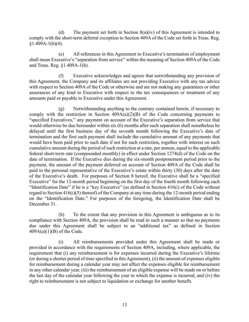 13 (d) The payment set forth in Section 8(a)(iv) of this Agreement is intended to comply with the short-term deferral exception to Section 409A of the Code set forth in Treas. Reg. §1.409A-1(b)(4). (e) All references in this Agreement to Executive’s termination of employment shall mean Executive’s “separation from service” within the meaning of Section 409A of the Code and Treas. Reg. §1.409A-1(h). (f) Executive acknowledges and agrees that notwithstanding any provision of this Agreement, the Company and its affiliates are not providing Executive with any tax advice with respect to Section 409A of the Code or otherwise and are not making any guarantees or other assurances of any kind to Executive with respect to the tax consequences or treatment of any amounts paid or payable to Executive under this Agreement. (g) Notwithstanding anything to the contrary contained herein, if necessary to comply with the restriction in Section 409A(a)(2)(B) of the Code concerning payments to “specified Executives,” any payment on account of the Executive’s separation from service that would otherwise be due hereunder within six (6) months after such separation shall nonetheless be delayed until the first business day of the seventh month following the Executive’s date of termination and the first such payment shall include the cumulative amount of any payments that would have been paid prior to such date if not for such restriction, together with interest on such cumulative amount during the period of such restriction at a rate, per annum, equal to the applicable federal short-term rate (compounded monthly) in effect under Section 1274(d) of the Code on the date of termination. If the Executive dies during the six-month postponement period prior to the payment, the amount of the payment deferred on account of Section 409A of the Code shall be paid to the personal representative of the Executive’s estate within thirty (30) days after the date of the Executive’s death. For purposes of Section 8 hereof, the Executive shall be a “specified Executive” for the 12-month period beginning on the first day of the fourth month following each “Identification Date” if he is a “key Executive” (as defined in Section 416(i) of the Code without regard to Section 416(i)(5) thereof) of the Company at any time during the 12-month period ending on the “Identification Date.” For purposes of the foregoing, the Identification Date shall be December 31. (h) To the extent that any provision in this Agreement is ambiguous as to its compliance with Section 409A, the provision shall be read in such a manner so that no payments due under this Agreement shall be subject to an “additional tax” as defined in Section 409A(a)(1)(B) of the Code. (i) All reimbursements provided under this Agreement shall be made or provided in accordance with the requirements of Section 409A, including, where applicable, the requirement that (i) any reimbursement is for expenses incurred during the Executive’s lifetime (or during a shorter period of time specified in this Agreement), (ii) the amount of expenses eligible for reimbursement during a calendar year may not affect the expenses eligible for reimbursement in any other calendar year, (iii) the reimbursement of an eligible expense will be made on or before the last day of the calendar year following the year in which the expense is incurred, and (iv) the right to reimbursement is not subject to liquidation or exchange for another benefit.