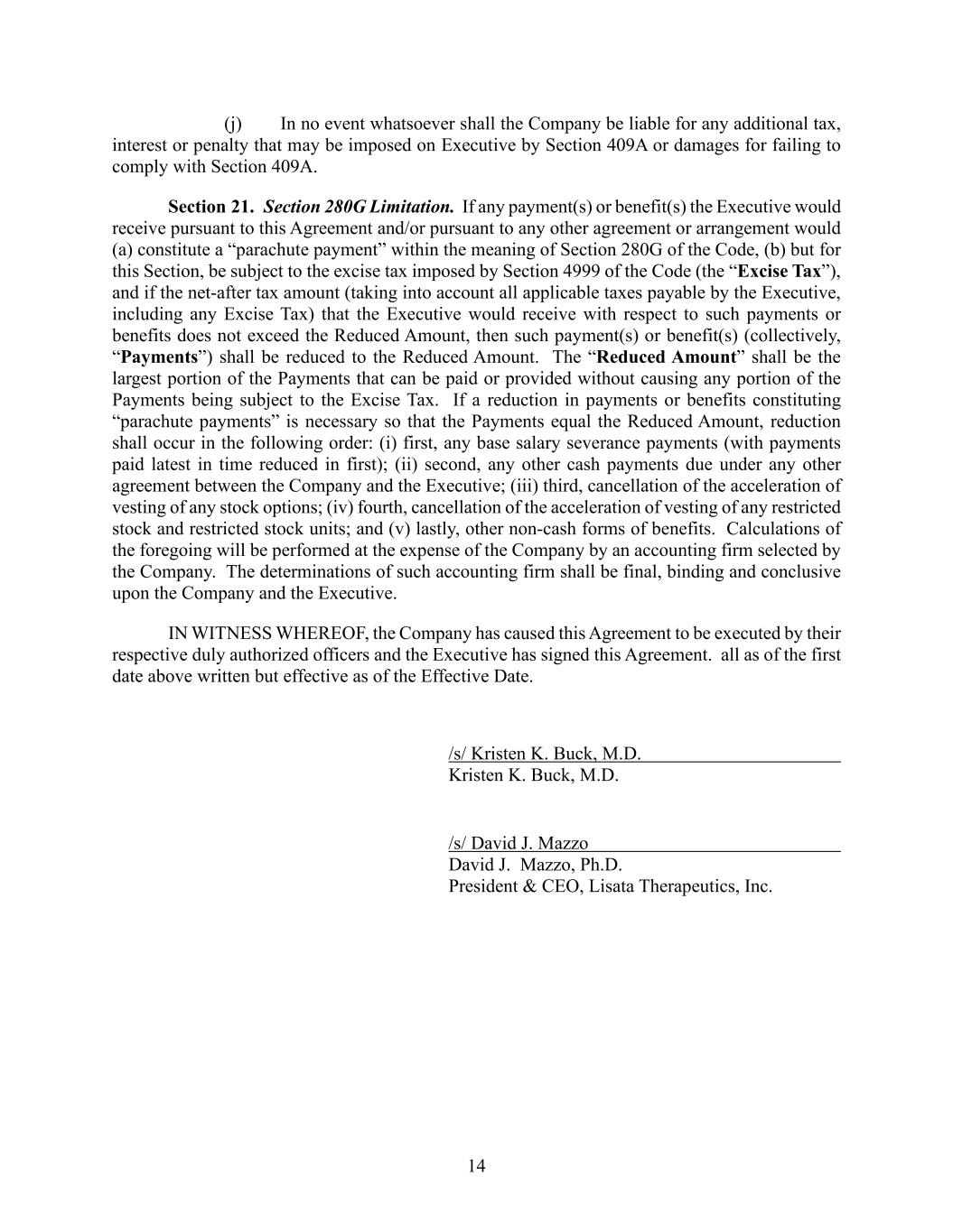 14 (j) In no event whatsoever shall the Company be liable for any additional tax, interest or penalty that may be imposed on Executive by Section 409A or damages for failing to comply with Section 409A. Section 21. Section 280G Limitation. If any payment(s) or benefit(s) the Executive would receive pursuant to this Agreement and/or pursuant to any other agreement or arrangement would (a) constitute a “parachute payment” within the meaning of Section 280G of the Code, (b) but for this Section, be subject to the excise tax imposed by Section 4999 of the Code (the “Excise Tax”), and if the net-after tax amount (taking into account all applicable taxes payable by the Executive, including any Excise Tax) that the Executive would receive with respect to such payments or benefits does not exceed the Reduced Amount, then such payment(s) or benefit(s) (collectively, “Payments”) shall be reduced to the Reduced Amount. The “Reduced Amount” shall be the largest portion of the Payments that can be paid or provided without causing any portion of the Payments being subject to the Excise Tax. If a reduction in payments or benefits constituting “parachute payments” is necessary so that the Payments equal the Reduced Amount, reduction shall occur in the following order: (i) first, any base salary severance payments (with payments paid latest in time reduced in first); (ii) second, any other cash payments due under any other agreement between the Company and the Executive; (iii) third, cancellation of the acceleration of vesting of any stock options; (iv) fourth, cancellation of the acceleration of vesting of any restricted stock and restricted stock units; and (v) lastly, other non-cash forms of benefits. Calculations of the foregoing will be performed at the expense of the Company by an accounting firm selected by the Company. The determinations of such accounting firm shall be final, binding and conclusive upon the Company and the Executive. IN WITNESS WHEREOF, the Company has caused this Agreement to be executed by their respective duly authorized officers and the Executive has signed this Agreement. all as of the first date above written but effective as of the Effective Date. /s/ Kristen K. Buck, M.D. Kristen K. Buck, M.D. /s/ David J. Mazzo David J. Mazzo, Ph.D. President & CEO, Lisata Therapeutics, Inc.