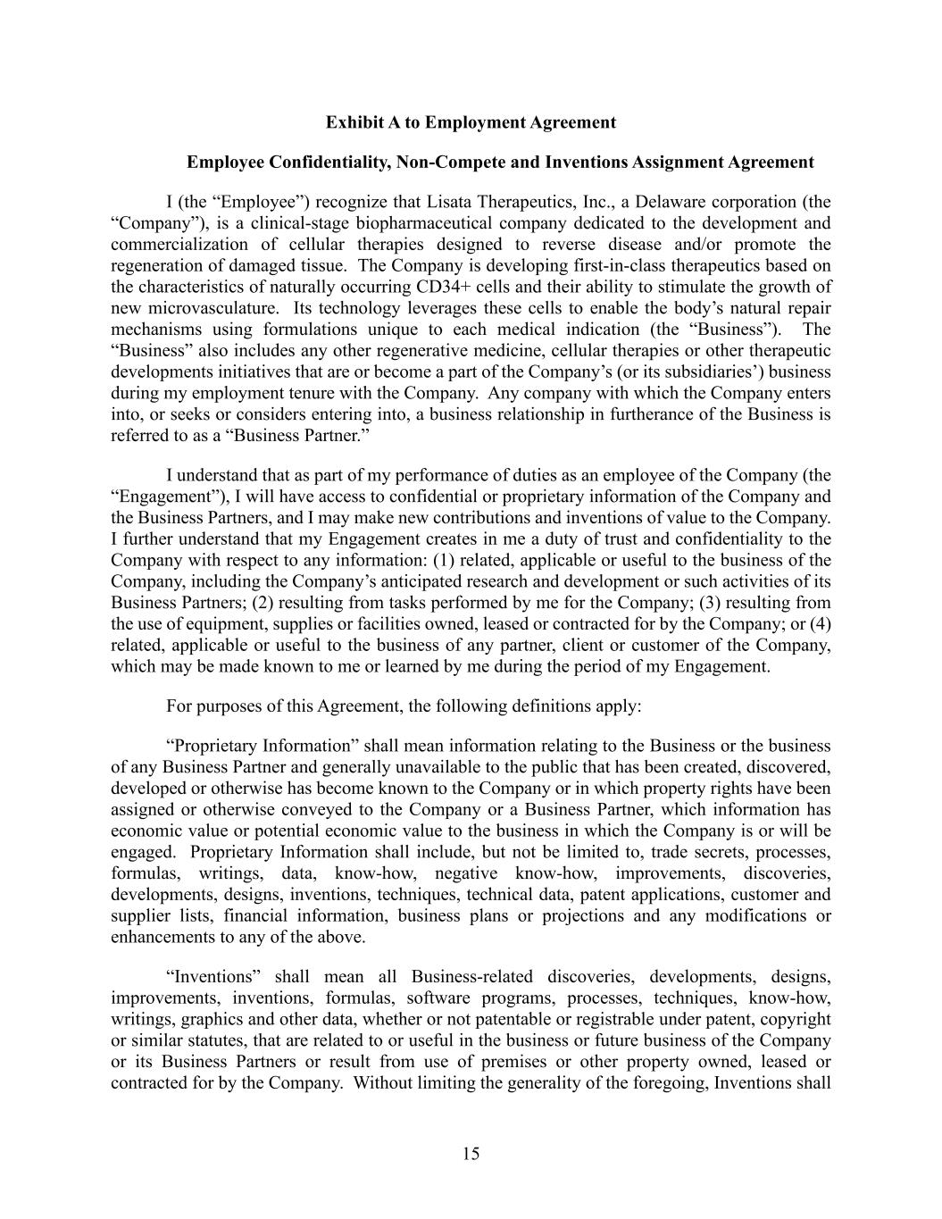 15 Exhibit A to Employment Agreement Employee Confidentiality, Non-Compete and Inventions Assignment Agreement I (the “Employee”) recognize that Lisata Therapeutics, Inc., a Delaware corporation (the “Company”), is a clinical-stage biopharmaceutical company dedicated to the development and commercialization of cellular therapies designed to reverse disease and/or promote the regeneration of damaged tissue. The Company is developing first-in-class therapeutics based on the characteristics of naturally occurring CD34+ cells and their ability to stimulate the growth of new microvasculature. Its technology leverages these cells to enable the body’s natural repair mechanisms using formulations unique to each medical indication (the “Business”). The “Business” also includes any other regenerative medicine, cellular therapies or other therapeutic developments initiatives that are or become a part of the Company’s (or its subsidiaries’) business during my employment tenure with the Company. Any company with which the Company enters into, or seeks or considers entering into, a business relationship in furtherance of the Business is referred to as a “Business Partner.” I understand that as part of my performance of duties as an employee of the Company (the “Engagement”), I will have access to confidential or proprietary information of the Company and the Business Partners, and I may make new contributions and inventions of value to the Company. I further understand that my Engagement creates in me a duty of trust and confidentiality to the Company with respect to any information: (1) related, applicable or useful to the business of the Company, including the Company’s anticipated research and development or such activities of its Business Partners; (2) resulting from tasks performed by me for the Company; (3) resulting from the use of equipment, supplies or facilities owned, leased or contracted for by the Company; or (4) related, applicable or useful to the business of any partner, client or customer of the Company, which may be made known to me or learned by me during the period of my Engagement. For purposes of this Agreement, the following definitions apply: “Proprietary Information” shall mean information relating to the Business or the business of any Business Partner and generally unavailable to the public that has been created, discovered, developed or otherwise has become known to the Company or in which property rights have been assigned or otherwise conveyed to the Company or a Business Partner, which information has economic value or potential economic value to the business in which the Company is or will be engaged. Proprietary Information shall include, but not be limited to, trade secrets, processes, formulas, writings, data, know-how, negative know-how, improvements, discoveries, developments, designs, inventions, techniques, technical data, patent applications, customer and supplier lists, financial information, business plans or projections and any modifications or enhancements to any of the above. “Inventions” shall mean all Business-related discoveries, developments, designs, improvements, inventions, formulas, software programs, processes, techniques, know-how, writings, graphics and other data, whether or not patentable or registrable under patent, copyright or similar statutes, that are related to or useful in the business or future business of the Company or its Business Partners or result from use of premises or other property owned, leased or contracted for by the Company. Without limiting the generality of the foregoing, Inventions shall