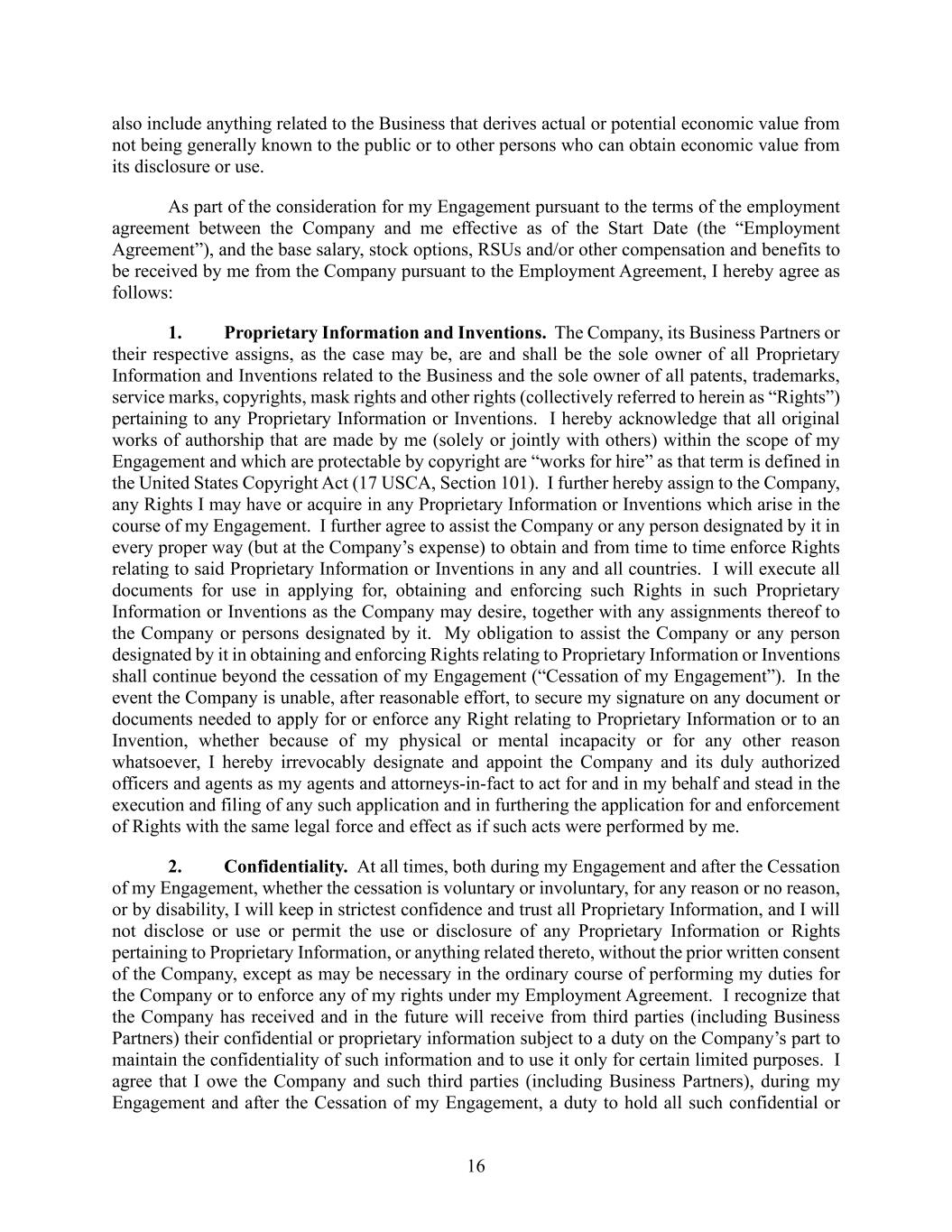 16 also include anything related to the Business that derives actual or potential economic value from not being generally known to the public or to other persons who can obtain economic value from its disclosure or use. As part of the consideration for my Engagement pursuant to the terms of the employment agreement between the Company and me effective as of the Start Date (the “Employment Agreement”), and the base salary, stock options, RSUs and/or other compensation and benefits to be received by me from the Company pursuant to the Employment Agreement, I hereby agree as follows: 1. Proprietary Information and Inventions. The Company, its Business Partners or their respective assigns, as the case may be, are and shall be the sole owner of all Proprietary Information and Inventions related to the Business and the sole owner of all patents, trademarks, service marks, copyrights, mask rights and other rights (collectively referred to herein as “Rights”) pertaining to any Proprietary Information or Inventions. I hereby acknowledge that all original works of authorship that are made by me (solely or jointly with others) within the scope of my Engagement and which are protectable by copyright are “works for hire” as that term is defined in the United States Copyright Act (17 USCA, Section 101). I further hereby assign to the Company, any Rights I may have or acquire in any Proprietary Information or Inventions which arise in the course of my Engagement. I further agree to assist the Company or any person designated by it in every proper way (but at the Company’s expense) to obtain and from time to time enforce Rights relating to said Proprietary Information or Inventions in any and all countries. I will execute all documents for use in applying for, obtaining and enforcing such Rights in such Proprietary Information or Inventions as the Company may desire, together with any assignments thereof to the Company or persons designated by it. My obligation to assist the Company or any person designated by it in obtaining and enforcing Rights relating to Proprietary Information or Inventions shall continue beyond the cessation of my Engagement (“Cessation of my Engagement”). In the event the Company is unable, after reasonable effort, to secure my signature on any document or documents needed to apply for or enforce any Right relating to Proprietary Information or to an Invention, whether because of my physical or mental incapacity or for any other reason whatsoever, I hereby irrevocably designate and appoint the Company and its duly authorized officers and agents as my agents and attorneys-in-fact to act for and in my behalf and stead in the execution and filing of any such application and in furthering the application for and enforcement of Rights with the same legal force and effect as if such acts were performed by me. 2. Confidentiality. At all times, both during my Engagement and after the Cessation of my Engagement, whether the cessation is voluntary or involuntary, for any reason or no reason, or by disability, I will keep in strictest confidence and trust all Proprietary Information, and I will not disclose or use or permit the use or disclosure of any Proprietary Information or Rights pertaining to Proprietary Information, or anything related thereto, without the prior written consent of the Company, except as may be necessary in the ordinary course of performing my duties for the Company or to enforce any of my rights under my Employment Agreement. I recognize that the Company has received and in the future will receive from third parties (including Business Partners) their confidential or proprietary information subject to a duty on the Company’s part to maintain the confidentiality of such information and to use it only for certain limited purposes. I agree that I owe the Company and such third parties (including Business Partners), during my Engagement and after the Cessation of my Engagement, a duty to hold all such confidential or