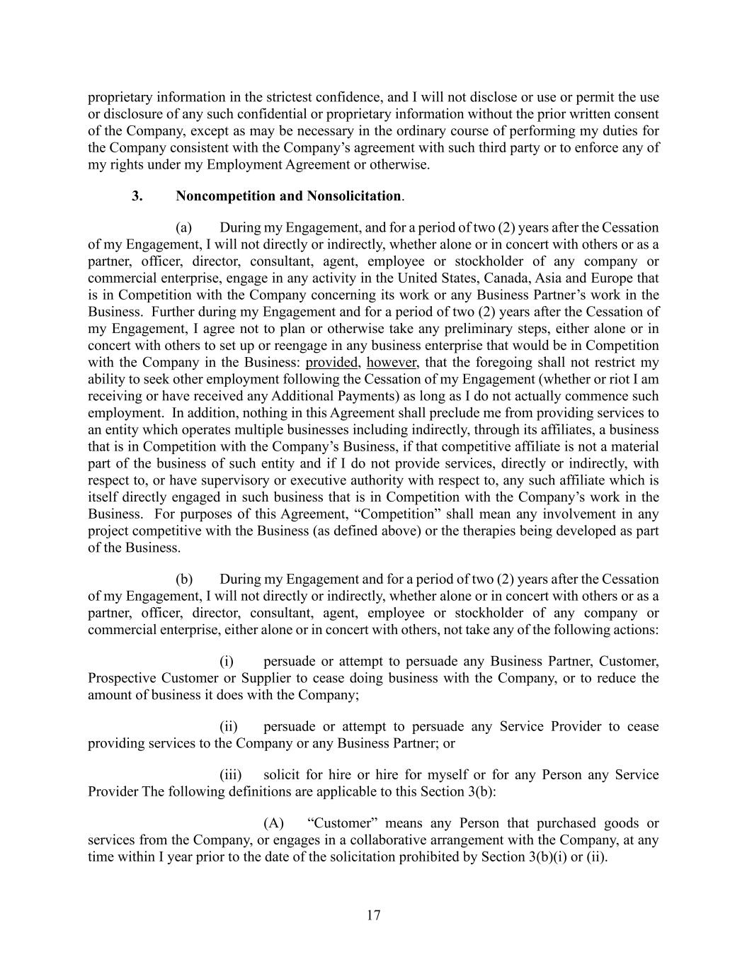 17 proprietary information in the strictest confidence, and I will not disclose or use or permit the use or disclosure of any such confidential or proprietary information without the prior written consent of the Company, except as may be necessary in the ordinary course of performing my duties for the Company consistent with the Company’s agreement with such third party or to enforce any of my rights under my Employment Agreement or otherwise. 3. Noncompetition and Nonsolicitation. (a) During my Engagement, and for a period of two (2) years after the Cessation of my Engagement, I will not directly or indirectly, whether alone or in concert with others or as a partner, officer, director, consultant, agent, employee or stockholder of any company or commercial enterprise, engage in any activity in the United States, Canada, Asia and Europe that is in Competition with the Company concerning its work or any Business Partner’s work in the Business. Further during my Engagement and for a period of two (2) years after the Cessation of my Engagement, I agree not to plan or otherwise take any preliminary steps, either alone or in concert with others to set up or reengage in any business enterprise that would be in Competition with the Company in the Business: provided, however, that the foregoing shall not restrict my ability to seek other employment following the Cessation of my Engagement (whether or riot I am receiving or have received any Additional Payments) as long as I do not actually commence such employment. In addition, nothing in this Agreement shall preclude me from providing services to an entity which operates multiple businesses including indirectly, through its affiliates, a business that is in Competition with the Company’s Business, if that competitive affiliate is not a material part of the business of such entity and if I do not provide services, directly or indirectly, with respect to, or have supervisory or executive authority with respect to, any such affiliate which is itself directly engaged in such business that is in Competition with the Company’s work in the Business. For purposes of this Agreement, “Competition” shall mean any involvement in any project competitive with the Business (as defined above) or the therapies being developed as part of the Business. (b) During my Engagement and for a period of two (2) years after the Cessation of my Engagement, I will not directly or indirectly, whether alone or in concert with others or as a partner, officer, director, consultant, agent, employee or stockholder of any company or commercial enterprise, either alone or in concert with others, not take any of the following actions: (i) persuade or attempt to persuade any Business Partner, Customer, Prospective Customer or Supplier to cease doing business with the Company, or to reduce the amount of business it does with the Company; (ii) persuade or attempt to persuade any Service Provider to cease providing services to the Company or any Business Partner; or (iii) solicit for hire or hire for myself or for any Person any Service Provider The following definitions are applicable to this Section 3(b): (A) “Customer” means any Person that purchased goods or services from the Company, or engages in a collaborative arrangement with the Company, at any time within I year prior to the date of the solicitation prohibited by Section 3(b)(i) or (ii).