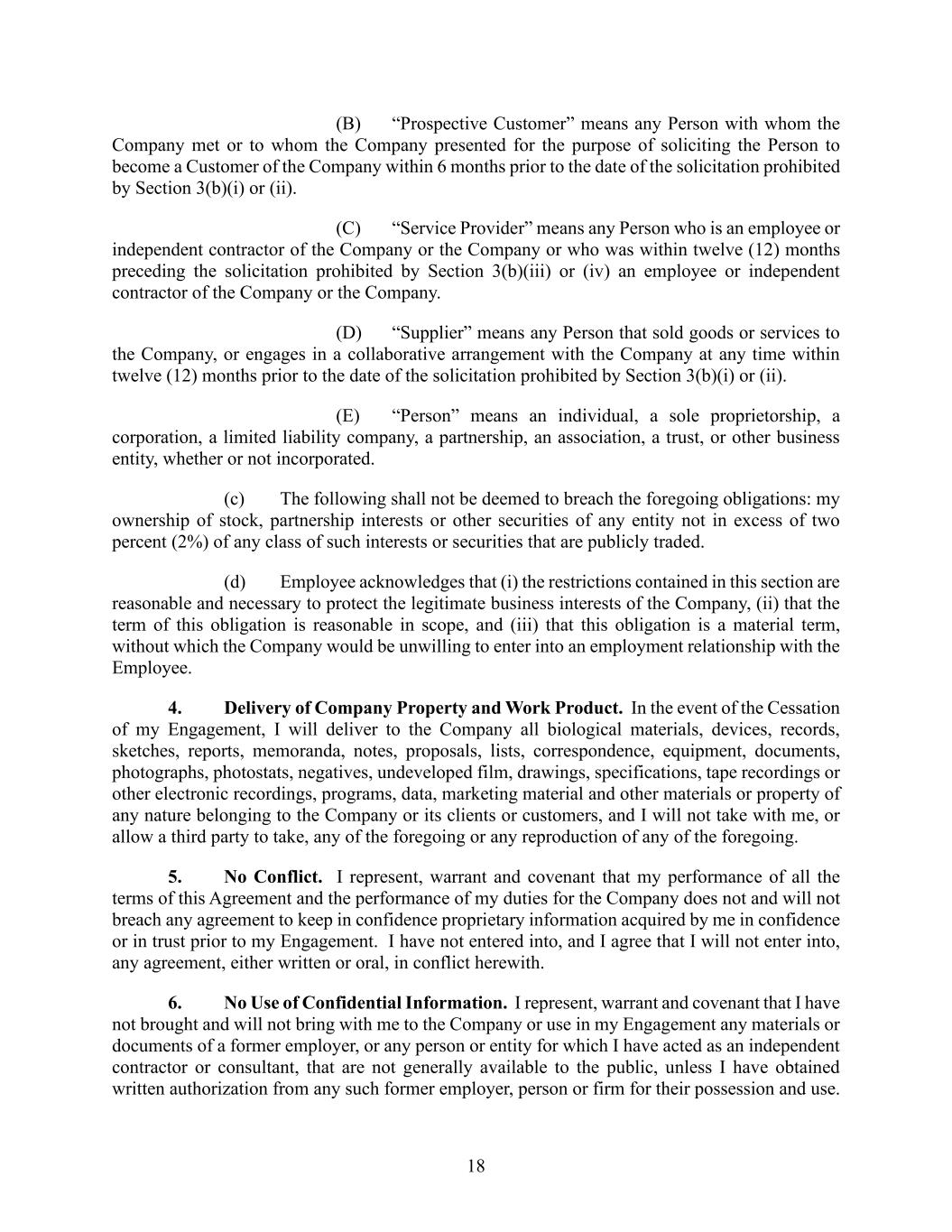 18 (B) “Prospective Customer” means any Person with whom the Company met or to whom the Company presented for the purpose of soliciting the Person to become a Customer of the Company within 6 months prior to the date of the solicitation prohibited by Section 3(b)(i) or (ii). (C) “Service Provider” means any Person who is an employee or independent contractor of the Company or the Company or who was within twelve (12) months preceding the solicitation prohibited by Section 3(b)(iii) or (iv) an employee or independent contractor of the Company or the Company. (D) “Supplier” means any Person that sold goods or services to the Company, or engages in a collaborative arrangement with the Company at any time within twelve (12) months prior to the date of the solicitation prohibited by Section 3(b)(i) or (ii). (E) “Person” means an individual, a sole proprietorship, a corporation, a limited liability company, a partnership, an association, a trust, or other business entity, whether or not incorporated. (c) The following shall not be deemed to breach the foregoing obligations: my ownership of stock, partnership interests or other securities of any entity not in excess of two percent (2%) of any class of such interests or securities that are publicly traded. (d) Employee acknowledges that (i) the restrictions contained in this section are reasonable and necessary to protect the legitimate business interests of the Company, (ii) that the term of this obligation is reasonable in scope, and (iii) that this obligation is a material term, without which the Company would be unwilling to enter into an employment relationship with the Employee. 4. Delivery of Company Property and Work Product. In the event of the Cessation of my Engagement, I will deliver to the Company all biological materials, devices, records, sketches, reports, memoranda, notes, proposals, lists, correspondence, equipment, documents, photographs, photostats, negatives, undeveloped film, drawings, specifications, tape recordings or other electronic recordings, programs, data, marketing material and other materials or property of any nature belonging to the Company or its clients or customers, and I will not take with me, or allow a third party to take, any of the foregoing or any reproduction of any of the foregoing. 5. No Conflict. I represent, warrant and covenant that my performance of all the terms of this Agreement and the performance of my duties for the Company does not and will not breach any agreement to keep in confidence proprietary information acquired by me in confidence or in trust prior to my Engagement. I have not entered into, and I agree that I will not enter into, any agreement, either written or oral, in conflict herewith. 6. No Use of Confidential Information. I represent, warrant and covenant that I have not brought and will not bring with me to the Company or use in my Engagement any materials or documents of a former employer, or any person or entity for which I have acted as an independent contractor or consultant, that are not generally available to the public, unless I have obtained written authorization from any such former employer, person or firm for their possession and use.