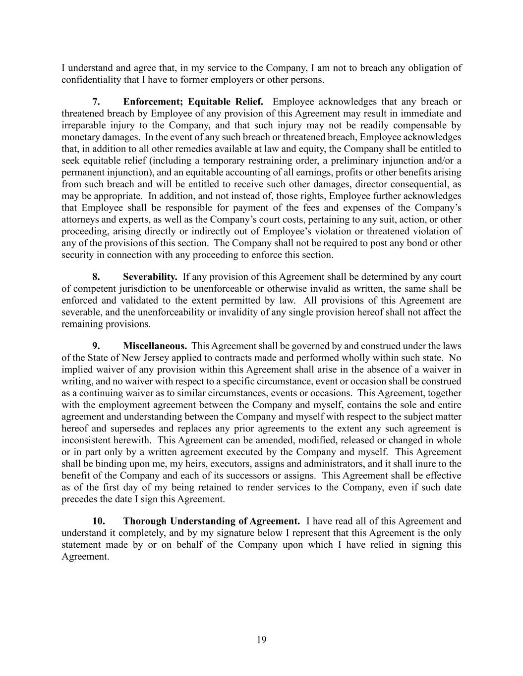 19 I understand and agree that, in my service to the Company, I am not to breach any obligation of confidentiality that I have to former employers or other persons. 7. Enforcement; Equitable Relief. Employee acknowledges that any breach or threatened breach by Employee of any provision of this Agreement may result in immediate and irreparable injury to the Company, and that such injury may not be readily compensable by monetary damages. In the event of any such breach or threatened breach, Employee acknowledges that, in addition to all other remedies available at law and equity, the Company shall be entitled to seek equitable relief (including a temporary restraining order, a preliminary injunction and/or a permanent injunction), and an equitable accounting of all earnings, profits or other benefits arising from such breach and will be entitled to receive such other damages, director consequential, as may be appropriate. In addition, and not instead of, those rights, Employee further acknowledges that Employee shall be responsible for payment of the fees and expenses of the Company’s attorneys and experts, as well as the Company’s court costs, pertaining to any suit, action, or other proceeding, arising directly or indirectly out of Employee’s violation or threatened violation of any of the provisions of this section. The Company shall not be required to post any bond or other security in connection with any proceeding to enforce this section. 8. Severability. If any provision of this Agreement shall be determined by any court of competent jurisdiction to be unenforceable or otherwise invalid as written, the same shall be enforced and validated to the extent permitted by law. All provisions of this Agreement are severable, and the unenforceability or invalidity of any single provision hereof shall not affect the remaining provisions. 9. Miscellaneous. This Agreement shall be governed by and construed under the laws of the State of New Jersey applied to contracts made and performed wholly within such state. No implied waiver of any provision within this Agreement shall arise in the absence of a waiver in writing, and no waiver with respect to a specific circumstance, event or occasion shall be construed as a continuing waiver as to similar circumstances, events or occasions. This Agreement, together with the employment agreement between the Company and myself, contains the sole and entire agreement and understanding between the Company and myself with respect to the subject matter hereof and supersedes and replaces any prior agreements to the extent any such agreement is inconsistent herewith. This Agreement can be amended, modified, released or changed in whole or in part only by a written agreement executed by the Company and myself. This Agreement shall be binding upon me, my heirs, executors, assigns and administrators, and it shall inure to the benefit of the Company and each of its successors or assigns. This Agreement shall be effective as of the first day of my being retained to render services to the Company, even if such date precedes the date I sign this Agreement. 10. Thorough Understanding of Agreement. I have read all of this Agreement and understand it completely, and by my signature below I represent that this Agreement is the only statement made by or on behalf of the Company upon which I have relied in signing this Agreement.