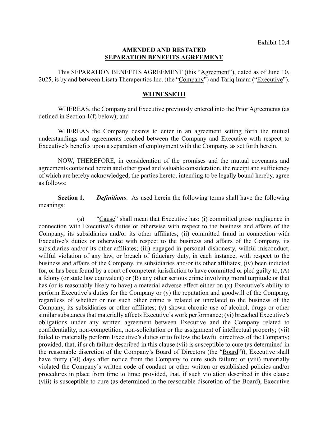 Exhibit 10.4 AMENDED AND RESTATED SEPARATION BENEFITS AGREEMENT This SEPARATION BENEFITS AGREEMENT (this “Agreement”), dated as of June 10, 2025, is by and between Lisata Therapeutics Inc. (the “Company”) and Tariq Imam (“Executive”). WITNESSETH WHEREAS, the Company and Executive previously entered into the Prior Agreements (as defined in Section 1(f) below); and WHEREAS the Company desires to enter in an agreement setting forth the mutual understandings and agreements reached between the Company and Executive with respect to Executive’s benefits upon a separation of employment with the Company, as set forth herein. NOW, THEREFORE, in consideration of the promises and the mutual covenants and agreements contained herein and other good and valuable consideration, the receipt and sufficiency of which are hereby acknowledged, the parties hereto, intending to be legally bound hereby, agree as follows: Section 1. Definitions. As used herein the following terms shall have the following meanings: (a) “Cause” shall mean that Executive has: (i) committed gross negligence in connection with Executive’s duties or otherwise with respect to the business and affairs of the Company, its subsidiaries and/or its other affiliates; (ii) committed fraud in connection with Executive’s duties or otherwise with respect to the business and affairs of the Company, its subsidiaries and/or its other affiliates; (iii) engaged in personal dishonesty, willful misconduct, willful violation of any law, or breach of fiduciary duty, in each instance, with respect to the business and affairs of the Company, its subsidiaries and/or its other affiliates; (iv) been indicted for, or has been found by a court of competent jurisdiction to have committed or pled guilty to, (A) a felony (or state law equivalent) or (B) any other serious crime involving moral turpitude or that has (or is reasonably likely to have) a material adverse effect either on (x) Executive’s ability to perform Executive’s duties for the Company or (y) the reputation and goodwill of the Company, regardless of whether or not such other crime is related or unrelated to the business of the Company, its subsidiaries or other affiliates; (v) shown chronic use of alcohol, drugs or other similar substances that materially affects Executive’s work performance; (vi) breached Executive’s obligations under any written agreement between Executive and the Company related to confidentiality, non-competition, non-solicitation or the assignment of intellectual property; (vii) failed to materially perform Executive’s duties or to follow the lawful directives of the Company; provided, that, if such failure described in this clause (vii) is susceptible to cure (as determined in the reasonable discretion of the Company’s Board of Directors (the “Board”)), Executive shall have thirty (30) days after notice from the Company to cure such failure; or (viii) materially violated the Company’s written code of conduct or other written or established policies and/or procedures in place from time to time; provided, that, if such violation described in this clause (viii) is susceptible to cure (as determined in the reasonable discretion of the Board), Executive