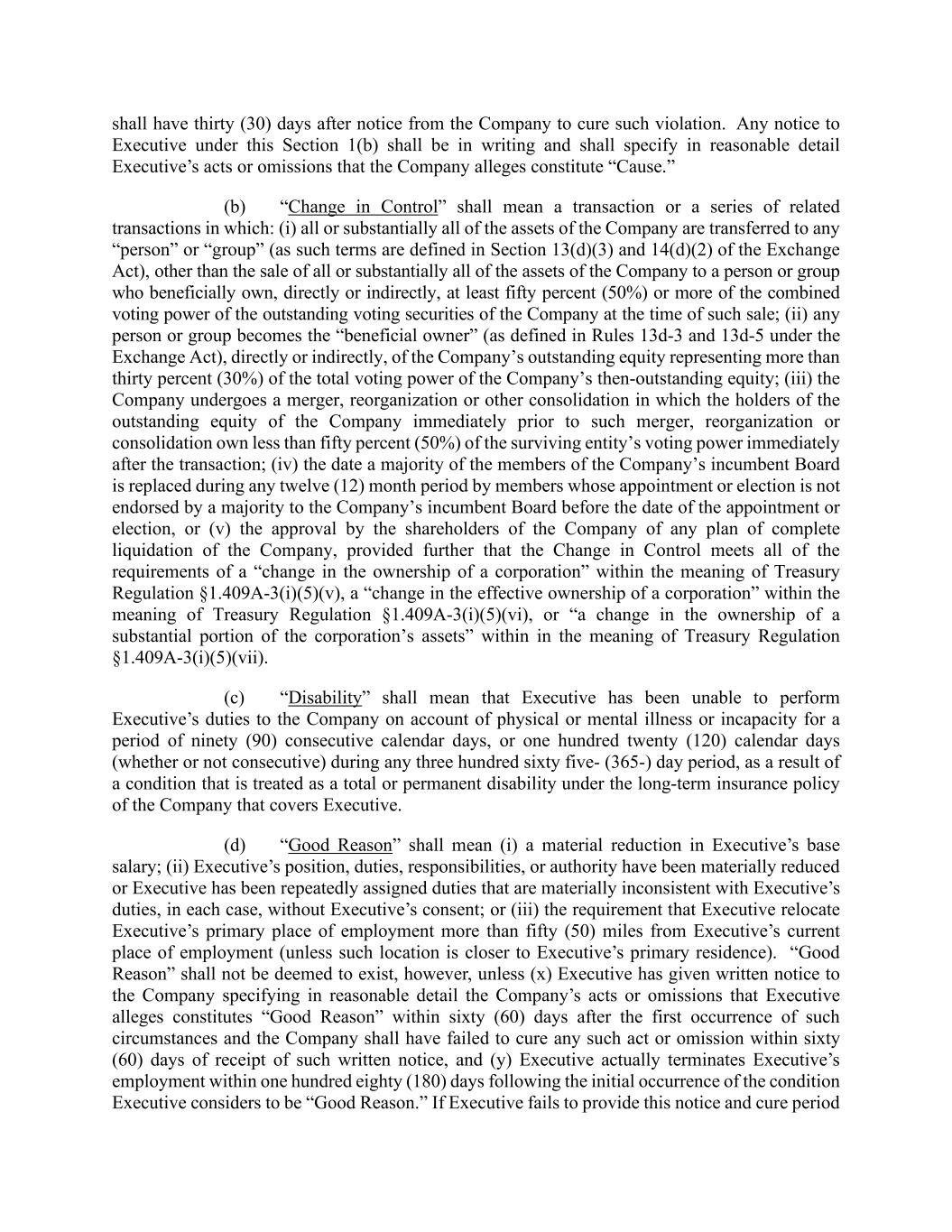 shall have thirty (30) days after notice from the Company to cure such violation. Any notice to Executive under this Section 1(b) shall be in writing and shall specify in reasonable detail Executive’s acts or omissions that the Company alleges constitute “Cause.” (b) “Change in Control” shall mean a transaction or a series of related transactions in which: (i) all or substantially all of the assets of the Company are transferred to any “person” or “group” (as such terms are defined in Section 13(d)(3) and 14(d)(2) of the Exchange Act), other than the sale of all or substantially all of the assets of the Company to a person or group who beneficially own, directly or indirectly, at least fifty percent (50%) or more of the combined voting power of the outstanding voting securities of the Company at the time of such sale; (ii) any person or group becomes the “beneficial owner” (as defined in Rules 13d-3 and 13d-5 under the Exchange Act), directly or indirectly, of the Company’s outstanding equity representing more than thirty percent (30%) of the total voting power of the Company’s then-outstanding equity; (iii) the Company undergoes a merger, reorganization or other consolidation in which the holders of the outstanding equity of the Company immediately prior to such merger, reorganization or consolidation own less than fifty percent (50%) of the surviving entity’s voting power immediately after the transaction; (iv) the date a majority of the members of the Company’s incumbent Board is replaced during any twelve (12) month period by members whose appointment or election is not endorsed by a majority to the Company’s incumbent Board before the date of the appointment or election, or (v) the approval by the shareholders of the Company of any plan of complete liquidation of the Company, provided further that the Change in Control meets all of the requirements of a “change in the ownership of a corporation” within the meaning of Treasury Regulation §1.409A-3(i)(5)(v), a “change in the effective ownership of a corporation” within the meaning of Treasury Regulation §1.409A-3(i)(5)(vi), or “a change in the ownership of a substantial portion of the corporation’s assets” within in the meaning of Treasury Regulation §1.409A-3(i)(5)(vii). (c) “Disability” shall mean that Executive has been unable to perform Executive’s duties to the Company on account of physical or mental illness or incapacity for a period of ninety (90) consecutive calendar days, or one hundred twenty (120) calendar days (whether or not consecutive) during any three hundred sixty five- (365-) day period, as a result of a condition that is treated as a total or permanent disability under the long-term insurance policy of the Company that covers Executive. (d) “Good Reason” shall mean (i) a material reduction in Executive’s base salary; (ii) Executive’s position, duties, responsibilities, or authority have been materially reduced or Executive has been repeatedly assigned duties that are materially inconsistent with Executive’s duties, in each case, without Executive’s consent; or (iii) the requirement that Executive relocate Executive’s primary place of employment more than fifty (50) miles from Executive’s current place of employment (unless such location is closer to Executive’s primary residence). “Good Reason” shall not be deemed to exist, however, unless (x) Executive has given written notice to the Company specifying in reasonable detail the Company’s acts or omissions that Executive alleges constitutes “Good Reason” within sixty (60) days after the first occurrence of such circumstances and the Company shall have failed to cure any such act or omission within sixty (60) days of receipt of such written notice, and (y) Executive actually terminates Executive’s employment within one hundred eighty (180) days following the initial occurrence of the condition Executive considers to be “Good Reason.” If Executive fails to provide this notice and cure period