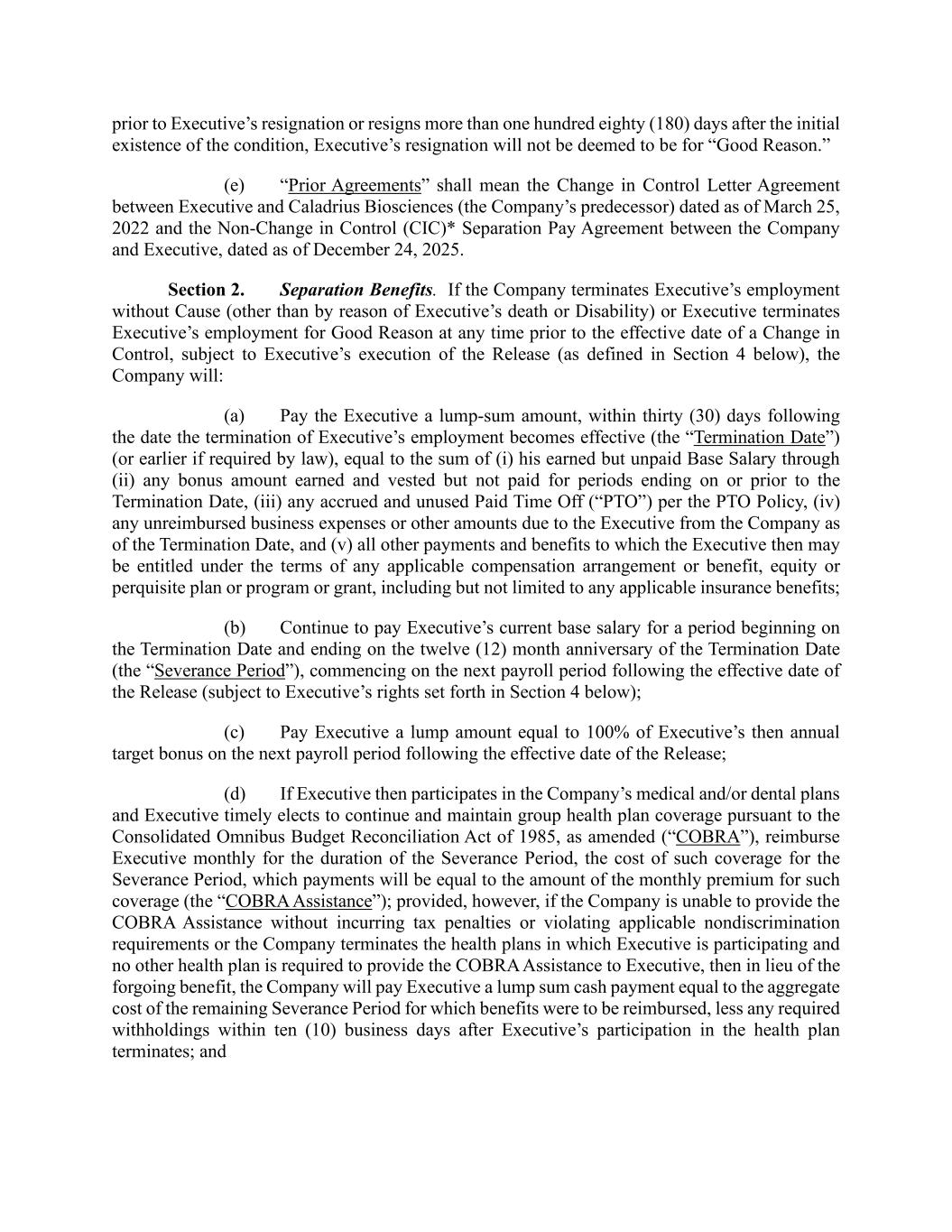 prior to Executive’s resignation or resigns more than one hundred eighty (180) days after the initial existence of the condition, Executive’s resignation will not be deemed to be for “Good Reason.” (e) “Prior Agreements” shall mean the Change in Control Letter Agreement between Executive and Caladrius Biosciences (the Company’s predecessor) dated as of March 25, 2022 and the Non-Change in Control (CIC)* Separation Pay Agreement between the Company and Executive, dated as of December 24, 2025. Section 2. Separation Benefits. If the Company terminates Executive’s employment without Cause (other than by reason of Executive’s death or Disability) or Executive terminates Executive’s employment for Good Reason at any time prior to the effective date of a Change in Control, subject to Executive’s execution of the Release (as defined in Section 4 below), the Company will: (a) Pay the Executive a lump-sum amount, within thirty (30) days following the date the termination of Executive’s employment becomes effective (the “Termination Date”) (or earlier if required by law), equal to the sum of (i) his earned but unpaid Base Salary through (ii) any bonus amount earned and vested but not paid for periods ending on or prior to the Termination Date, (iii) any accrued and unused Paid Time Off (“PTO”) per the PTO Policy, (iv) any unreimbursed business expenses or other amounts due to the Executive from the Company as of the Termination Date, and (v) all other payments and benefits to which the Executive then may be entitled under the terms of any applicable compensation arrangement or benefit, equity or perquisite plan or program or grant, including but not limited to any applicable insurance benefits; (b) Continue to pay Executive’s current base salary for a period beginning on the Termination Date and ending on the twelve (12) month anniversary of the Termination Date (the “Severance Period”), commencing on the next payroll period following the effective date of the Release (subject to Executive’s rights set forth in Section 4 below); (c) Pay Executive a lump amount equal to 100% of Executive’s then annual target bonus on the next payroll period following the effective date of the Release; (d) If Executive then participates in the Company’s medical and/or dental plans and Executive timely elects to continue and maintain group health plan coverage pursuant to the Consolidated Omnibus Budget Reconciliation Act of 1985, as amended (“COBRA”), reimburse Executive monthly for the duration of the Severance Period, the cost of such coverage for the Severance Period, which payments will be equal to the amount of the monthly premium for such coverage (the “COBRA Assistance”); provided, however, if the Company is unable to provide the COBRA Assistance without incurring tax penalties or violating applicable nondiscrimination requirements or the Company terminates the health plans in which Executive is participating and no other health plan is required to provide the COBRA Assistance to Executive, then in lieu of the forgoing benefit, the Company will pay Executive a lump sum cash payment equal to the aggregate cost of the remaining Severance Period for which benefits were to be reimbursed, less any required withholdings within ten (10) business days after Executive’s participation in the health plan terminates; and