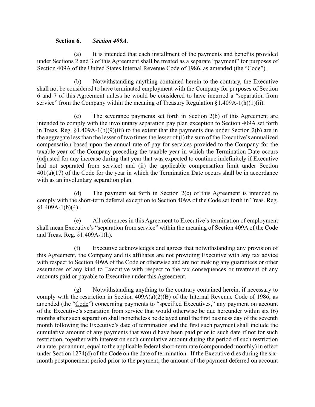 Section 6. Section 409A. (a) It is intended that each installment of the payments and benefits provided under Sections 2 and 3 of this Agreement shall be treated as a separate “payment” for purposes of Section 409A of the United States Internal Revenue Code of 1986, as amended (the “Code”). (b) Notwithstanding anything contained herein to the contrary, the Executive shall not be considered to have terminated employment with the Company for purposes of Section 6 and 7 of this Agreement unless he would be considered to have incurred a “separation from service” from the Company within the meaning of Treasury Regulation §1.409A-1(h)(1)(ii). (c) The severance payments set forth in Section 2(b) of this Agreement are intended to comply with the involuntary separation pay plan exception to Section 409A set forth in Treas. Reg. §1.409A-1(b)(9)(iii) to the extent that the payments due under Section 2(b) are in the aggregate less than the lesser of two times the lesser of (i) the sum of the Executive’s annualized compensation based upon the annual rate of pay for services provided to the Company for the taxable year of the Company preceding the taxable year in which the Termination Date occurs (adjusted for any increase during that year that was expected to continue indefinitely if Executive had not separated from service) and (ii) the applicable compensation limit under Section 401(a)(17) of the Code for the year in which the Termination Date occurs shall be in accordance with as an involuntary separation plan. (d) The payment set forth in Section 2(c) of this Agreement is intended to comply with the short-term deferral exception to Section 409A of the Code set forth in Treas. Reg. §1.409A-1(b)(4). (e) All references in this Agreement to Executive’s termination of employment shall mean Executive’s “separation from service” within the meaning of Section 409A of the Code and Treas. Reg. §1.409A-1(h). (f) Executive acknowledges and agrees that notwithstanding any provision of this Agreement, the Company and its affiliates are not providing Executive with any tax advice with respect to Section 409A of the Code or otherwise and are not making any guarantees or other assurances of any kind to Executive with respect to the tax consequences or treatment of any amounts paid or payable to Executive under this Agreement. (g) Notwithstanding anything to the contrary contained herein, if necessary to comply with the restriction in Section 409A(a)(2)(B) of the Internal Revenue Code of 1986, as amended (the “Code”) concerning payments to “specified Executives,” any payment on account of the Executive’s separation from service that would otherwise be due hereunder within six (6) months after such separation shall nonetheless be delayed until the first business day of the seventh month following the Executive’s date of termination and the first such payment shall include the cumulative amount of any payments that would have been paid prior to such date if not for such restriction, together with interest on such cumulative amount during the period of such restriction at a rate, per annum, equal to the applicable federal short-term rate (compounded monthly) in effect under Section 1274(d) of the Code on the date of termination. If the Executive dies during the six- month postponement period prior to the payment, the amount of the payment deferred on account