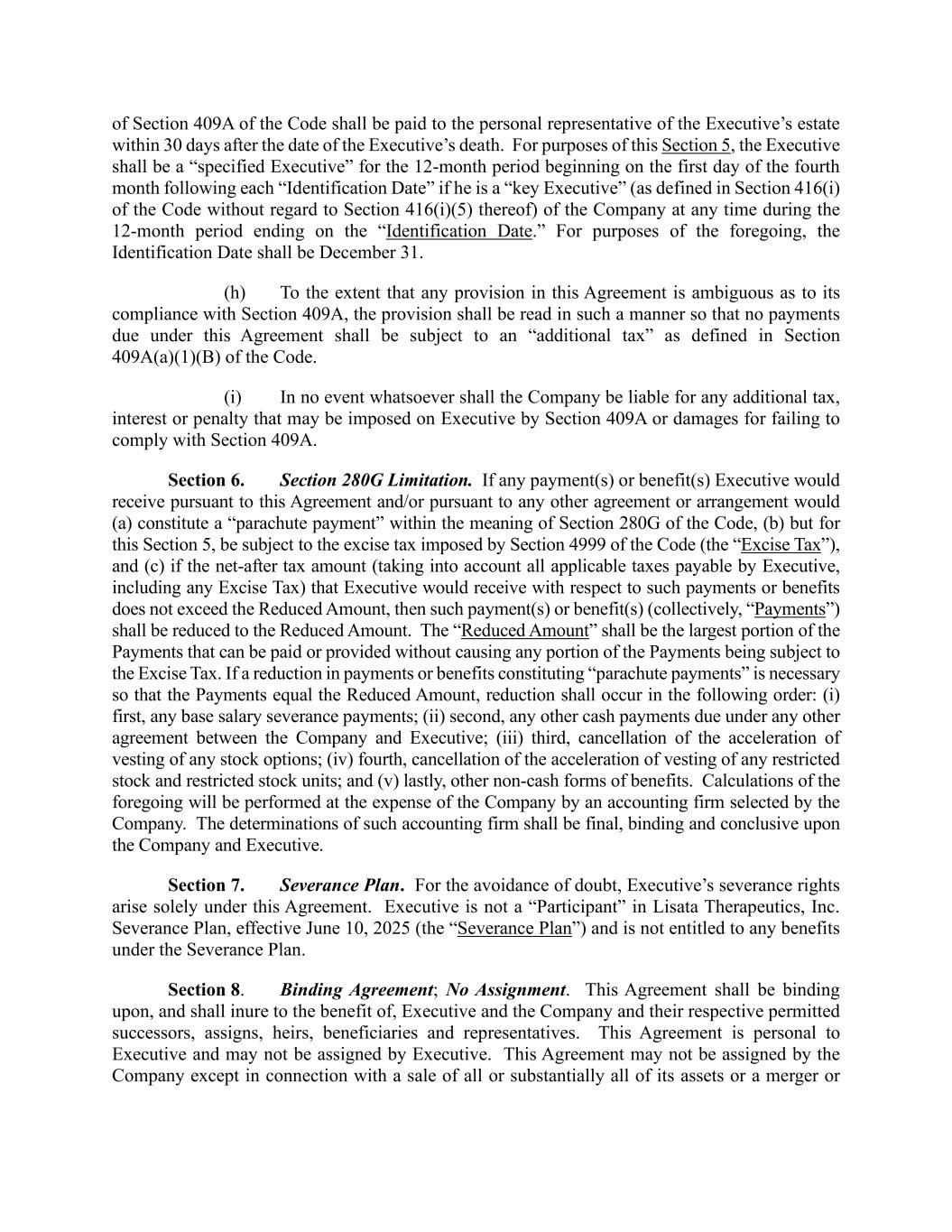 of Section 409A of the Code shall be paid to the personal representative of the Executive’s estate within 30 days after the date of the Executive’s death. For purposes of this Section 5, the Executive shall be a “specified Executive” for the 12-month period beginning on the first day of the fourth month following each “Identification Date” if he is a “key Executive” (as defined in Section 416(i) of the Code without regard to Section 416(i)(5) thereof) of the Company at any time during the 12-month period ending on the “Identification Date.” For purposes of the foregoing, the Identification Date shall be December 31. (h) To the extent that any provision in this Agreement is ambiguous as to its compliance with Section 409A, the provision shall be read in such a manner so that no payments due under this Agreement shall be subject to an “additional tax” as defined in Section 409A(a)(1)(B) of the Code. (i) In no event whatsoever shall the Company be liable for any additional tax, interest or penalty that may be imposed on Executive by Section 409A or damages for failing to comply with Section 409A. Section 6. Section 280G Limitation. If any payment(s) or benefit(s) Executive would receive pursuant to this Agreement and/or pursuant to any other agreement or arrangement would (a) constitute a “parachute payment” within the meaning of Section 280G of the Code, (b) but for this Section 5, be subject to the excise tax imposed by Section 4999 of the Code (the “Excise Tax”), and (c) if the net-after tax amount (taking into account all applicable taxes payable by Executive, including any Excise Tax) that Executive would receive with respect to such payments or benefits does not exceed the Reduced Amount, then such payment(s) or benefit(s) (collectively, “Payments”) shall be reduced to the Reduced Amount. The “Reduced Amount” shall be the largest portion of the Payments that can be paid or provided without causing any portion of the Payments being subject to the Excise Tax. If a reduction in payments or benefits constituting “parachute payments” is necessary so that the Payments equal the Reduced Amount, reduction shall occur in the following order: (i) first, any base salary severance payments; (ii) second, any other cash payments due under any other agreement between the Company and Executive; (iii) third, cancellation of the acceleration of vesting of any stock options; (iv) fourth, cancellation of the acceleration of vesting of any restricted stock and restricted stock units; and (v) lastly, other non-cash forms of benefits. Calculations of the foregoing will be performed at the expense of the Company by an accounting firm selected by the Company. The determinations of such accounting firm shall be final, binding and conclusive upon the Company and Executive. Section 7. Severance Plan. For the avoidance of doubt, Executive’s severance rights arise solely under this Agreement. Executive is not a “Participant” in Lisata Therapeutics, Inc. Severance Plan, effective June 10, 2025 (the “Severance Plan”) and is not entitled to any benefits under the Severance Plan. Section 8. Binding Agreement; No Assignment. This Agreement shall be binding upon, and shall inure to the benefit of, Executive and the Company and their respective permitted successors, assigns, heirs, beneficiaries and representatives. This Agreement is personal to Executive and may not be assigned by Executive. This Agreement may not be assigned by the Company except in connection with a sale of all or substantially all of its assets or a merger or