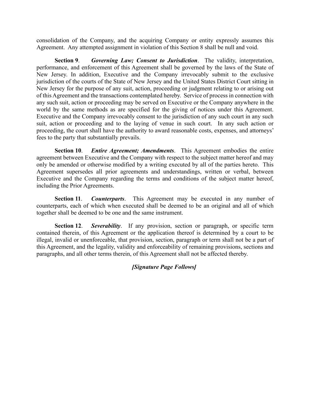 consolidation of the Company, and the acquiring Company or entity expressly assumes this Agreement. Any attempted assignment in violation of this Section 8 shall be null and void. Section 9. Governing Law; Consent to Jurisdiction. The validity, interpretation, performance, and enforcement of this Agreement shall be governed by the laws of the State of New Jersey. In addition, Executive and the Company irrevocably submit to the exclusive jurisdiction of the courts of the State of New Jersey and the United States District Court sitting in New Jersey for the purpose of any suit, action, proceeding or judgment relating to or arising out of this Agreement and the transactions contemplated hereby. Service of process in connection with any such suit, action or proceeding may be served on Executive or the Company anywhere in the world by the same methods as are specified for the giving of notices under this Agreement. Executive and the Company irrevocably consent to the jurisdiction of any such court in any such suit, action or proceeding and to the laying of venue in such court. In any such action or proceeding, the court shall have the authority to award reasonable costs, expenses, and attorneys’ fees to the party that substantially prevails. Section 10. Entire Agreement; Amendments. This Agreement embodies the entire agreement between Executive and the Company with respect to the subject matter hereof and may only be amended or otherwise modified by a writing executed by all of the parties hereto. This Agreement supersedes all prior agreements and understandings, written or verbal, between Executive and the Company regarding the terms and conditions of the subject matter hereof, including the Prior Agreements. Section 11. Counterparts. This Agreement may be executed in any number of counterparts, each of which when executed shall be deemed to be an original and all of which together shall be deemed to be one and the same instrument. Section 12. Severability. If any provision, section or paragraph, or specific term contained therein, of this Agreement or the application thereof is determined by a court to be illegal, invalid or unenforceable, that provision, section, paragraph or term shall not be a part of this Agreement, and the legality, validity and enforceability of remaining provisions, sections and paragraphs, and all other terms therein, of this Agreement shall not be affected thereby. [Signature Page Follows]