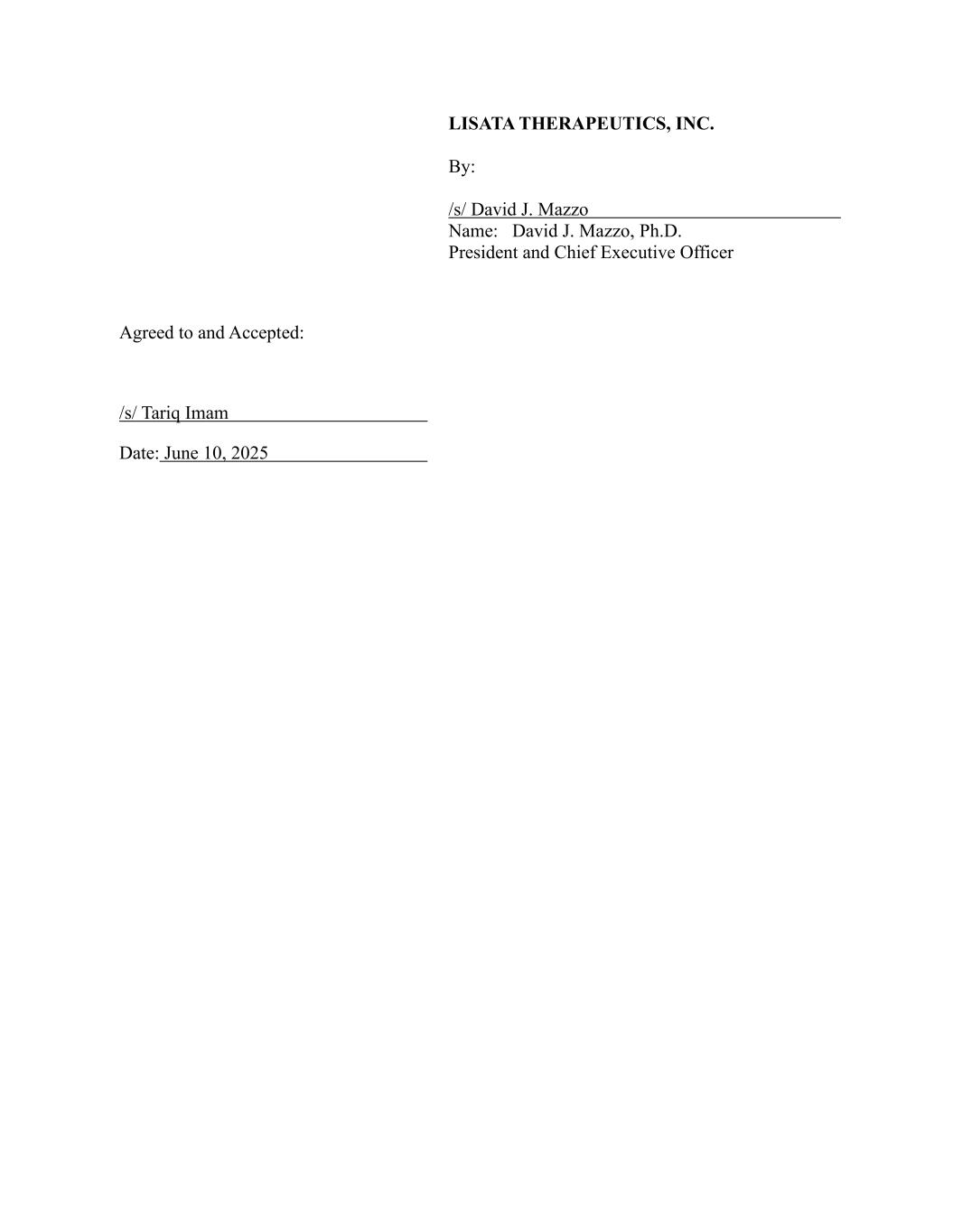 LISATA THERAPEUTICS, INC. By: /s/ David J. Mazzo Name: David J. Mazzo, Ph.D. President and Chief Executive Officer Agreed to and Accepted: /s/ Tariq Imam Date: June 10, 2025