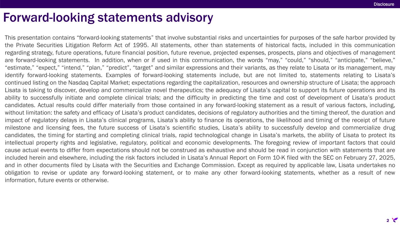 © L i s a t a T h e r a p e u t i c s , I n c . 2 0 2 5 . A l l r i g h t s r e s e r v e d . Targeted Therapy Delivered www.lisata.com Corporate Presentation | June 26, 2025 Nasdaq: LSTA Exhibit 99.2