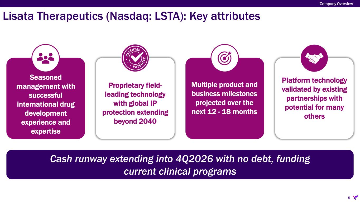 Lisata Therapeutics (Nasdaq: LSTA) Company Overview 4 OVERVIEW Clinical-stage therapeutics company rapidly developing a novel solid tumor targeting and penetration technology with tumor microenvironment (TME) modifying properties. MISSION To enhance the treatment benefits of existing and emerging therapies for solid tumors and similar diseases without additional side effects utilizing an approach that is patient-friendly and pharmacoeconomically attractive.