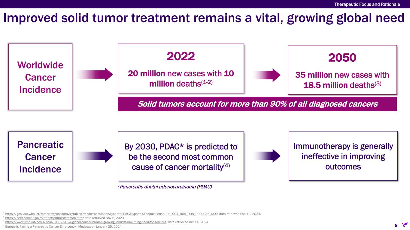 Improved solid tumor treatment remains a vital, growing global need Worldwide Cancer Incidence 2022 20 million new cases with 10 million deaths(1-2) 2050 35 million new cases with 18.5 million deaths(3) Solid tumors account for more than 90% of all diagnosed cancers Pancreatic Cancer Incidence By 2030, PDAC* is predicted to be the second most common cause of cancer mortality(4) Immunotherapy is generally ineffective in improving outcomes *Pancreatic ductal adenocarcinoma (PDAC) 1 https://gco.iarc.who.int/tomorrow/en/dataviz/tables?mode=population&years=2050&types=1&populations=903_904_905_908_909_935_900; data retrieved Feb 12, 2024. 2 https://seer.cancer.gov/statfacts/html/common.html; data retrieved Nov 2, 2023. 3 https://www.who.int/news/item/01-02-2024-global-cancer-burden-growing--amidst-mounting-need-for-services; data retrieved Oct 14, 2024. 4 Europe Is Facing a Pancreatic Cancer Emergency - Medscape - January 25, 2024. 8 Therapeutic Focus and Rationale