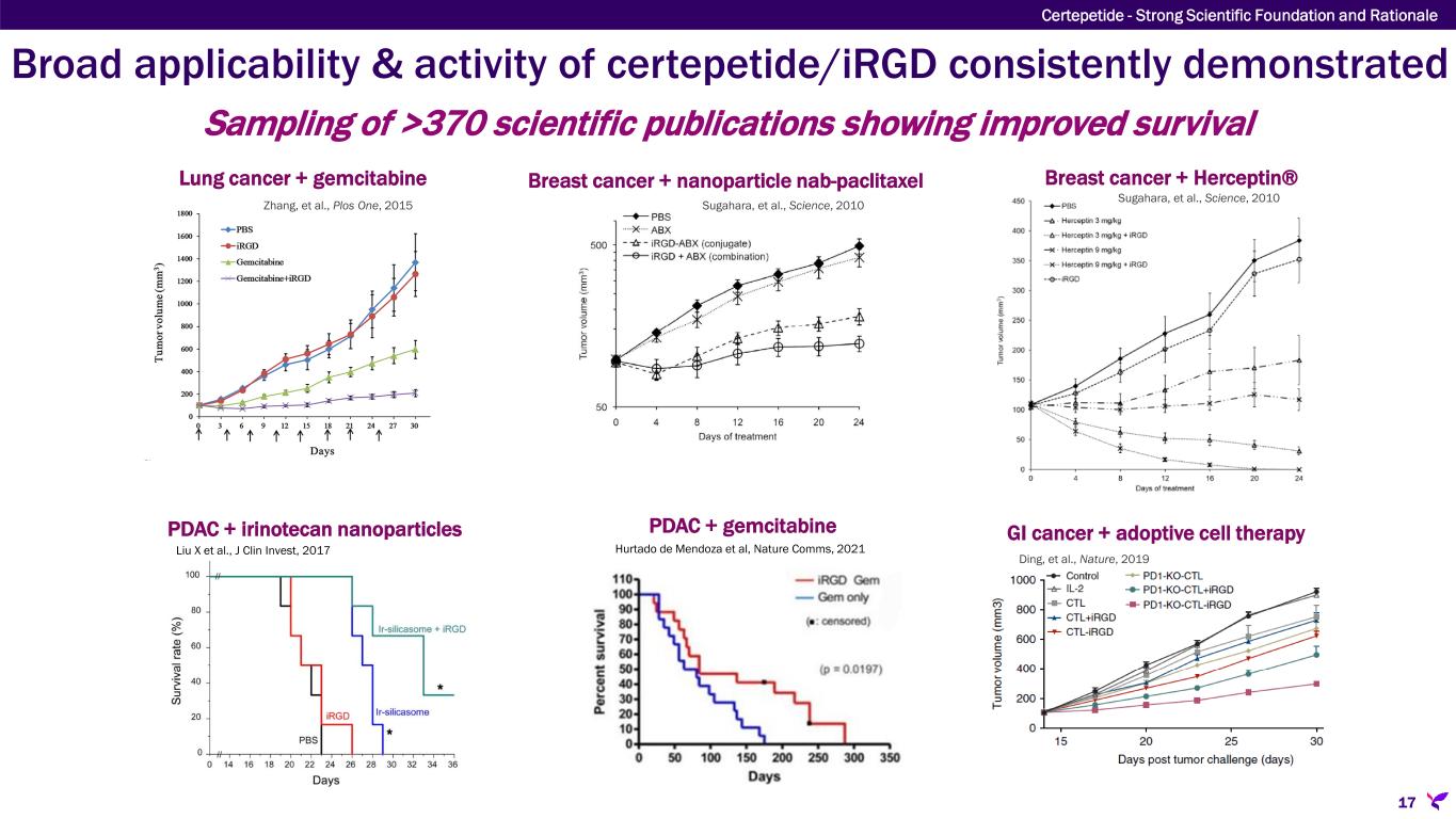 Certepetide/iRGD selectively promotes intratumoral penetration 1 Braun et al., Nature Mater. 2014. 2 Liu, Braun et al., Nature Comm. 2017. 3 Sugahara et al 2010. 16 Certepetide - Strong Scientific Foundation and Rationale Whole body imaging of mice with pancreatic ductal adenocarcinoma (arrow) dosed with Fluorescent Quantum Dots (FQDs) with and without certepetide(1),(2)  Circulating FQDs result in whole body fluorescence  Etching solution quenches fluorescence in circulation tumor FQDs + Etching solution tumor Certepetide + FQDs + Etching solution When co-administered with iRGD, nab- paclitaxel (Abraxane or ABX) is preferentially taken up by tumor tissue in mice(3) FQDs