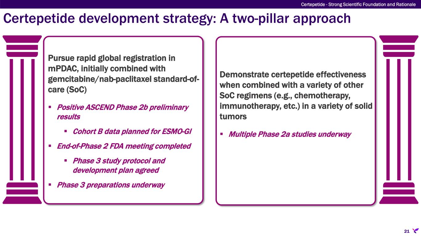iRGD enhances selective tumor penetration of trastuzumab Mouse model injected with human BT474 breast tumors  Panel A shows greater staining for trastuzumab in breast cancer tissue with iRGD  Panel B shows remarkable selectivity for tumor tissue with iRGD  Panel C shows iRGD co-administered with trastuzumab leads to tumor shrinkage Sugahara, et al. 2010 Certepetide - Strong Scientific Foundation and Rationale 20 Trastuzumab + iRGDTrastuzumab A CB Tumor Liver Spleen HeartPancreas Lung Kidney Brain Certepetide is a proprietary iRGD; experiments denoting iRGD use a non-proprietary certepetide analog with differs in structure by a single acetyl group. Trastuzumab is a monoclonal Ab that inhibits HER2