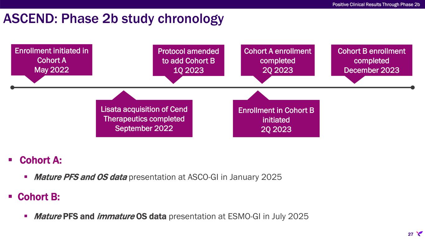 ASCEND: Phase 2b study of certepetide in mPDAC  Sponsor: Australasian Gastro-Intestinal Trials Group (AGITG) and NHMRC Clinical Trials Centre of University of Sydney (Australia) • Lisata-funded, data contractually sponsor- controlled • Restricts initial public announcement of results to scientific meetings or publications  ‘Academic design’ overlooks global regulatory standards supporting eventual approval • Powered for 6-mos. PFS primary endpoint • Not a standard regulatory endpoint • Single cohort with one IV push of certepetide 3.2 mg/kg + SoC vs. SoC alone Investigator initiated trial inherited through acquisition of Cend Therapeutics Lisata amended protocol to ensure trial data will support global registration strategy  Lisata clinical trial data rights defined/expanded  ‘Product development design’ considers eventual regulatory review and approval  Median overall survival (precedent registration endpoint) added for both cohorts  Second cohort (Cohort B) added with two IV pushes of certepetide 3.2 mg/kg administered 4 hours apart to further evaluate pharmacodynamics of certepetide consistent with FDA Project Optimus 26 Positive Clinical Results Through Phase 2b