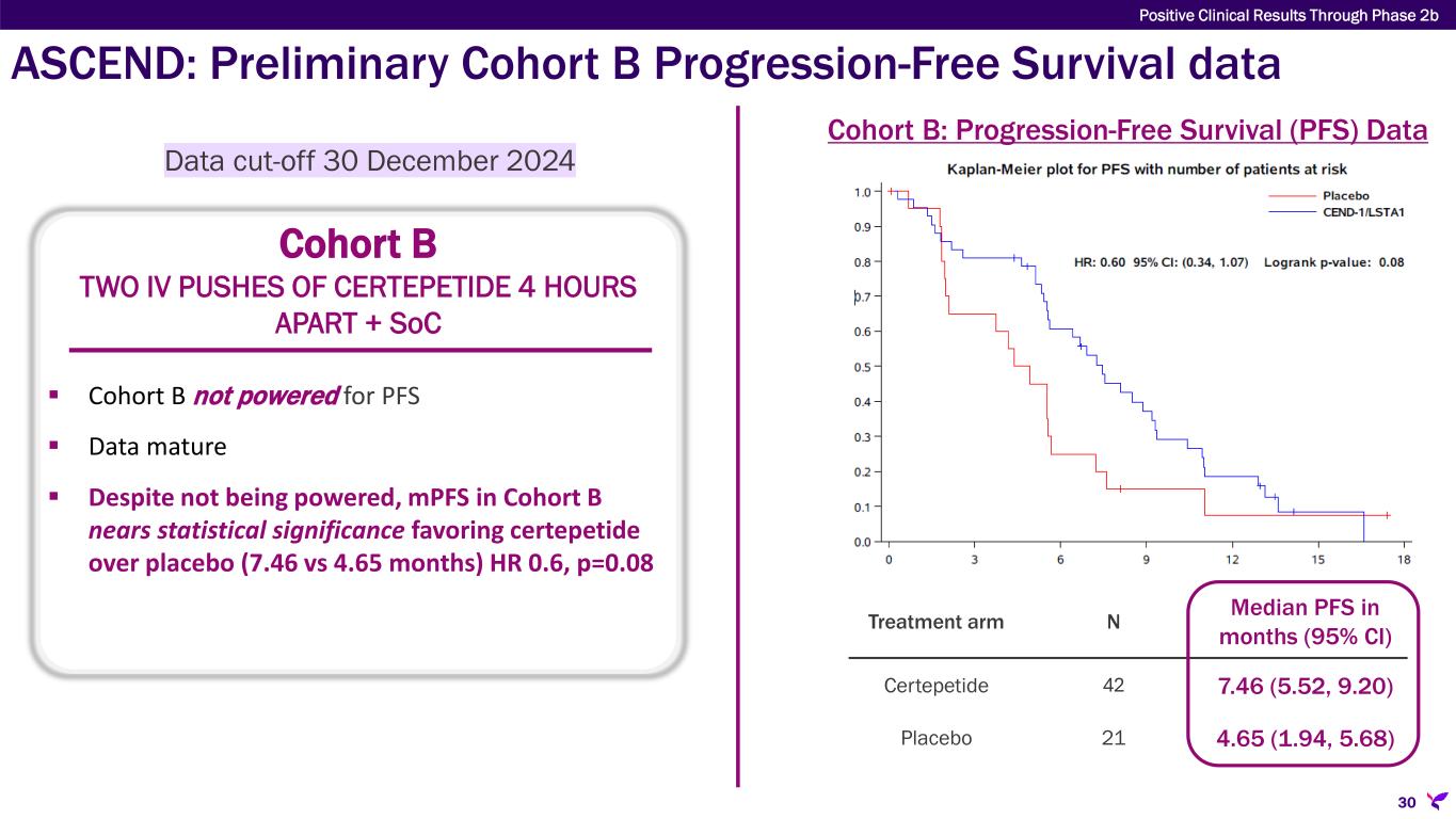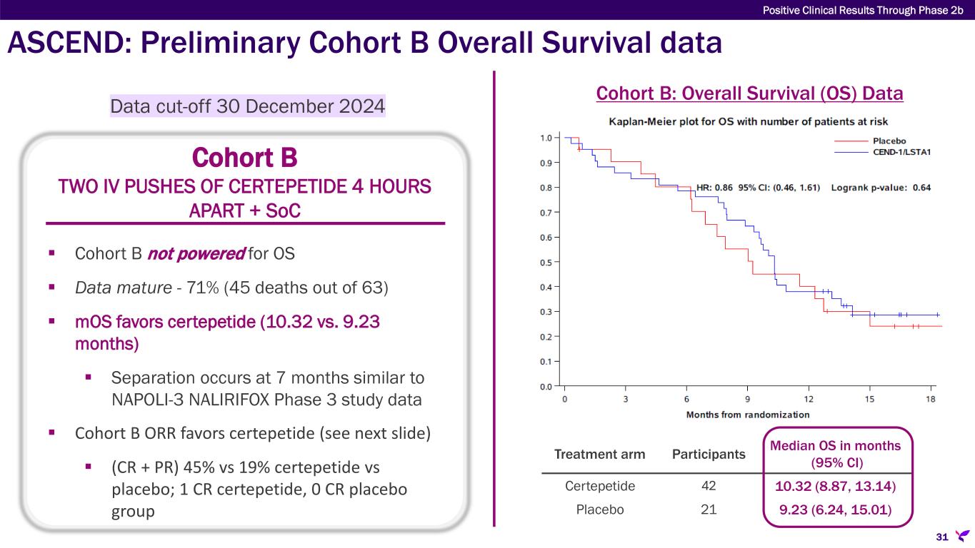ASCEND: Preliminary Cohort B Progression-Free Survival data Cohort B TWO IV PUSHES OF CERTEPETIDE 4 HOURS APART + SoC Cohort B: Progression-Free Survival (PFS) Data Treatment arm N Median PFS in months (95% CI) Certepetide 42 7.46 (5.52, 9.20) Placebo 21 4.65 (1.94, 5.68) Data cut-off 30 December 2024  Cohort B not powered for PFS  Data mature  Despite not being powered, mPFS in Cohort B nears statistical significance favoring certepetide over placebo (7.46 vs 4.65 months) HR 0.6, p=0.08 Positive Clinical Results Through Phase 2b 30