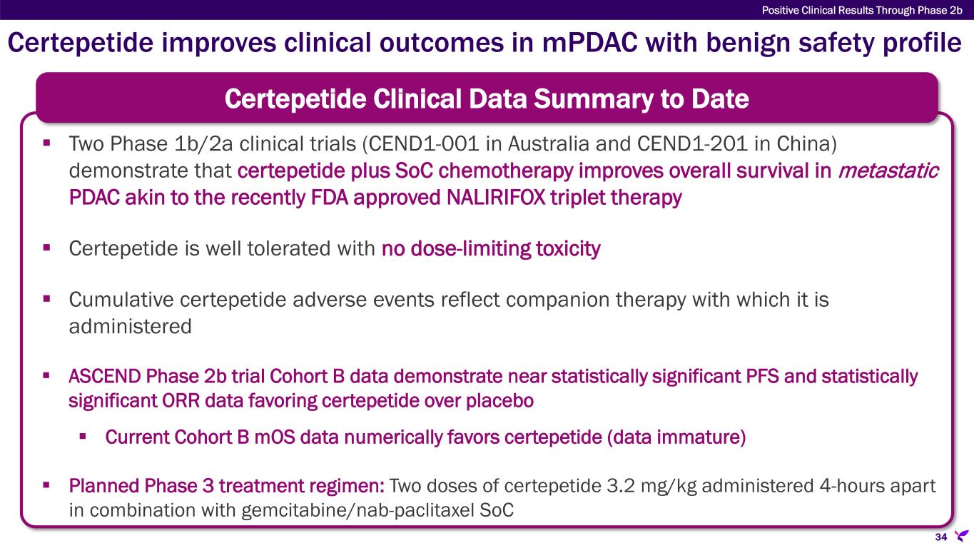 ASCEND: Phase 2 study of certepetide in mPDAC in summary  mOS in Cohort A numerically favored certepetide as did ORR (4 Complete Responses in the certepetide + SoC group and 0 in the placebo + SoC group)  Despite not being powered, mPFS in Cohort B nears statistical significance favoring certepetide over placebo (7.46 vs 4.65 months) HR 0.6, p=0.08.  Cohort B mOS favored certepetide (10.32 vs 9.23 months) corroborating clinical benefit  Cohort B ORR favored certepetide  Excluding unknown/early withdrawal/death, ORR statistically significant favoring certepetide  50.0% certepetide treated patients had complete or partial response vs 21.1% placebo  1 Complete Response in the certepetide group compared to zero in the placebo group  Certepetide treated subjects stayed on treatment longer than those on placebo (5.00 vs. 3.22 months)  Adverse events were comparable across treatment groups and reflect toxicities of concomitant cytotoxics and disease under study Certepetide improves clinical outcomes in mPDAC with benign safety profile Positive Clinical Results Through Phase 2b 33