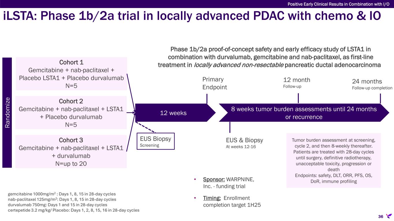 Cohort 2 Gemcitabine + nab-paclitaxel + LSTA1 + Placebo durvalumab N=5 Cohort 1 Gemcitabine + nab-paclitaxel + Placebo LSTA1 + Placebo durvalumab N=5 Cohort 3 Gemcitabine + nab-paclitaxel + LSTA1 + durvalumab N=up to 20 12 weeks 8 weeks tumor burden assessments until 24 months or recurrence 12 month Follow-up Primary Endpoint 24 months Follow-up completion EUS Biopsy Screening EUS & Biopsy At weeks 12-16 Tumor burden assessment at screening, cycle 2, and then 8-weekly thereafter. Patients are treated with 28-day cycles until surgery, definitive radiotherapy, unacceptable toxicity, progression or death Endpoints: safety, DLT, ORR, PFS, OS, DoR, immune profiling Ra nd om iz e Phase 1b/2a proof-of-concept safety and early efficacy study of LSTA1 in combination with durvalumab, gemcitabine and nab-paclitaxel, as first-line treatment in locally advanced non-resectable pancreatic ductal adenocarcinoma • Sponsor: WARPNINE, Inc. - funding trial • Timing: Enrollment completion target 1H25 36 iLSTA: Phase 1b/2a trial in locally advanced PDAC with chemo & IO gemcitabine 1000mg/m2 : Days 1, 8, 15 in 28-day cycles nab-paclitaxel 125mg/m2: Days 1, 8, 15 in 28-day cycles durvalumab 750mg: Days 1 and 15 in 28-day cycles certepetide 3.2 mg/kg/ Placebo: Days 1, 2, 8, 15, 16 in 28-day cycles Positive Early Clinical Results in Combination with I/O