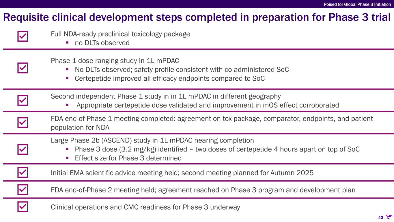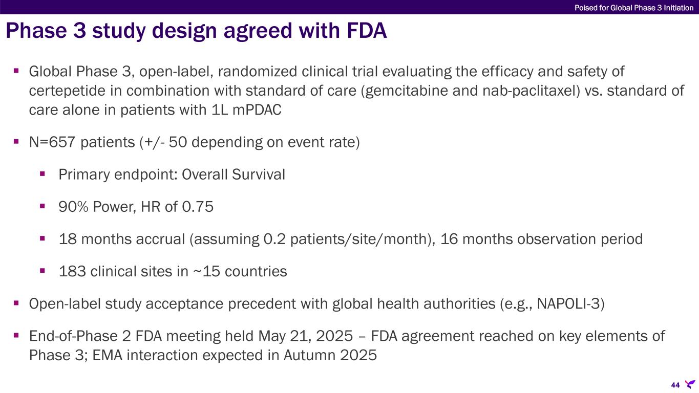 Requisite clinical development steps completed in preparation for Phase 3 trial Full NDA-ready preclinical toxicology package  no DLTs observed Phase 1 dose ranging study in 1L mPDAC  No DLTs observed; safety profile consistent with co-administered SoC  Certepetide improved all efficacy endpoints compared to SoC Second independent Phase 1 study in in 1L mPDAC in different geography  Appropriate certepetide dose validated and improvement in mOS effect corroborated FDA end-of-Phase 1 meeting completed: agreement on tox package, comparator, endpoints, and patient population for NDA Large Phase 2b (ASCEND) study in 1L mPDAC nearing completion  Phase 3 dose (3.2 mg/kg) identified – two doses of certepetide 4 hours apart on top of SoC  Effect size for Phase 3 determined Initial EMA scientific advice meeting held; second meeting planned for Autumn 2025 FDA end-of-Phase 2 meeting held; agreement reached on Phase 3 program and development plan Clinical operations and CMC readiness for Phase 3 underway Poised for Global Phase 3 Initiation 43