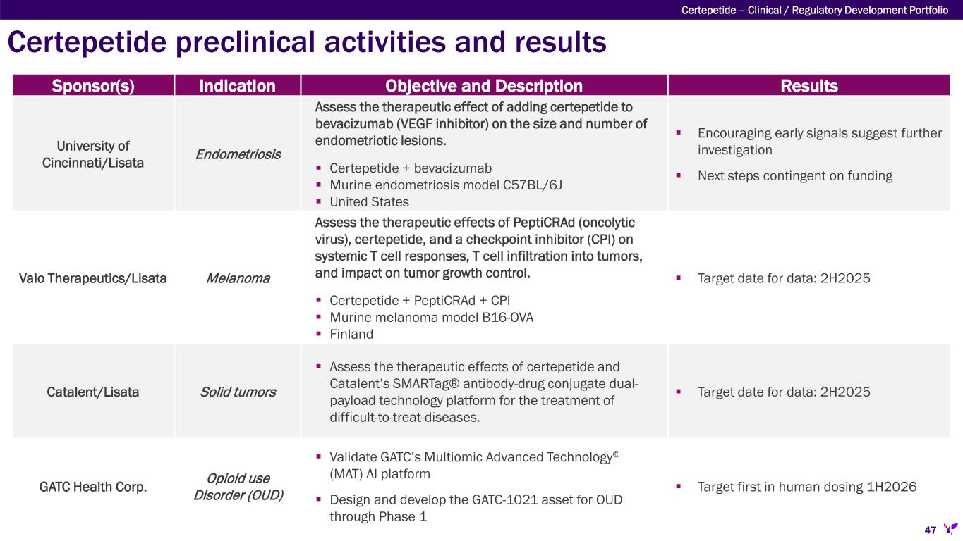 Certepetide preclinical activities and results Sponsor(s) Indication Objective and Description Results University of Cincinnati/Lisata Endometriosis Assess the therapeutic effect of adding certepetide to bevacizumab (VEGF inhibitor) on the size and number of endometriotic lesions.  Certepetide + bevacizumab  Murine endometriosis model C57BL/6J  United States  Encouraging early signals suggest further investigation  Next steps contingent on funding Valo Therapeutics/Lisata Melanoma Assess the therapeutic effects of PeptiCRAd (oncolytic virus), certepetide, and a checkpoint inhibitor (CPI) on systemic T cell responses, T cell infiltration into tumors, and impact on tumor growth control.  Certepetide + PeptiCRAd + CPI  Murine melanoma model B16-OVA  Finland  Target date for data: 2H2025 Catalent/Lisata Solid tumors  Assess the therapeutic effects of certepetide and Catalent’s SMARTag® antibody-drug conjugate dual- payload technology platform for the treatment of difficult-to-treat-diseases.  Target date for data: 2H2025 GATC Health Corp. Opioid use Disorder (OUD)  Validate GATC’s Multiomic Advanced Technology® (MAT) AI platform  Design and develop the GATC-1021 asset for OUD through Phase 1  Target first in human dosing 1H2026 Certepetide – Clinical / Regulatory Development Portfolio 47