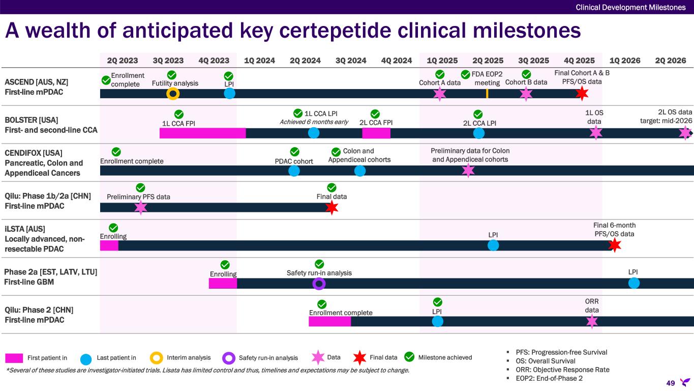 A wealth of anticipated key certepetide clinical milestones Clinical Development Milestones 49 2Q 2023 3Q 2023 4Q 2023 1Q 2024 2Q 2024 3Q 2024 4Q 2024 1Q 2025 2Q 2025 3Q 2025 4Q 2025 1Q 2026 2Q 2026 ASCEND [AUS, NZ] First-line mPDAC BOLSTER [USA] First- and second-line CCA CENDIFOX [USA] Pancreatic, Colon and Appendiceal Cancers Qilu: Phase 1b/2a [CHN] First-line mPDAC iLSTA [AUS] Locally advanced, non- resectable PDAC Phase 2a [EST, LATV, LTU] First-line GBM Qilu: Phase 2 [CHN] First-line mPDAC Preliminary PFS data Final data *Several of these studies are investigator-initiated trials. Lisata has limited control and thus, timelines and expectations may be subject to change.  PFS: Progression-free Survival  OS: Overall Survival  ORR: Objective Response Rate  EOP2: End-of-Phase 2 First patient in Last patient in Interim analysis Data Final data Milestone achievedSafety run-in analysis Enrolling Safety run-in analysis Final 6-month PFS/OS data Enrolling Cohort A data Final Cohort A & B PFS/OS data Futility analysis Enrollment complete LPI 2L OS data target: mid-20261L CCA FPI 1L CCA LPI Achieved 6 months early 2L CCA LPI2L CCA FPI 1L OS data PDAC cohort Colon and Appendiceal cohortsEnrollment complete Preliminary data for Colon and Appendiceal cohorts ORR dataEnrollment complete LPI LPI LPI FDA EOP2 meeting Cohort B data