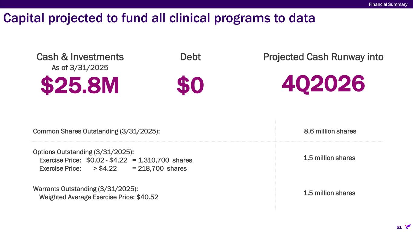 Capital projected to fund all clinical programs to data Financial Summary 51 $25.8M Cash & Investments As of 3/31/2025 $0 Debt 4Q2026 Projected Cash Runway into Common Shares Outstanding (3/31/2025): 8.6 million shares Options Outstanding (3/31/2025): Exercise Price: $0.02 - $4.22 = 1,310,700 shares Exercise Price: > $4.22 = 218,700 shares 1.5 million shares Warrants Outstanding (3/31/2025): Weighted Average Exercise Price: $40.52 1.5 million shares