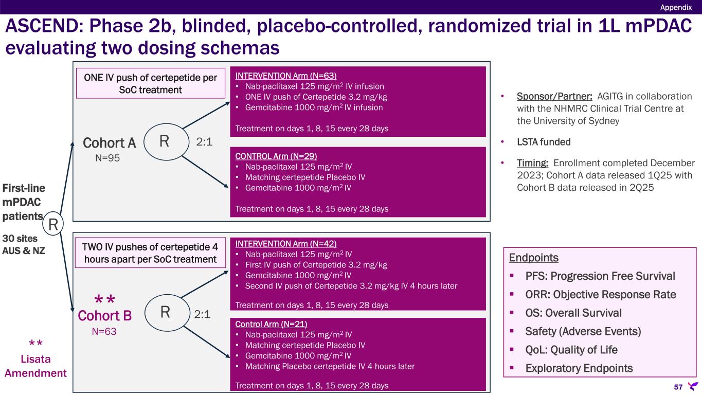 ASCEND: Phase 2b, blinded, randomized trial in mPDAC 56 Appendix Sponsor/Partner  Australasian Gastro-Intestinal Trials Group (AGITG) in collaboration with the NHMRC Clinical Trials Centre at the University of Sydney  Lisata funded (LSTA eligible for ~43% rebate on all qualified R&D expenses in AUS) Objective  Corroborate Phase 1b results in a placebo-controlled study  Determine if a second dose of certepetide further improves patient outcomes Design  Phase 2b randomized, double-blind study in mPDAC testing gemcitabine + nab-paclitaxel SoC with one of two certepetide dose regimens or placebo Study Size  N=158 (~30 sites in Australia and New Zealand) Endpoints  Primary: Progression Free Survival  Secondary: AEs, SAEs, Overall Survival, Objective Tumor Response Rate Timing  Enrollment completed December 2023  Preliminary Cohort A data was presented at ASCO-GI in June 2025  Preliminary Cohort B data to be presented at ESMO-GI in July 2025