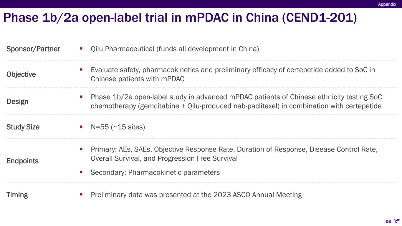 Sponsor/Partner  Qilu Pharmaceutical (funds all development in China) Objective  Evaluate safety, pharmacokinetics and preliminary efficacy of certepetide added to SoC in Chinese patients with mPDAC Design  Phase 1b/2a open-label study in advanced mPDAC patients of Chinese ethnicity testing SoC chemotherapy (gemcitabine + Qilu-produced nab-paclitaxel) in combination with certepetide Study Size  N=55 (~15 sites) Endpoints  Primary: AEs, SAEs, Objective Response Rate, Duration of Response, Disease Control Rate, Overall Survival, and Progression Free Survival  Secondary: Pharmacokinetic parameters Timing  Preliminary data was presented at the 2023 ASCO Annual Meeting Appendix 58 Phase 1b/2a open-label trial in mPDAC in China (CEND1-201)
