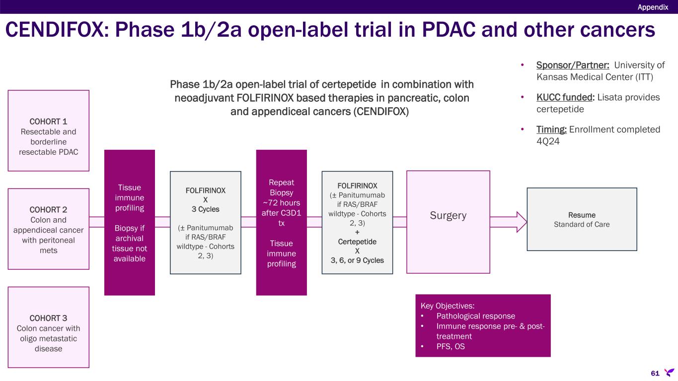 Sponsor/Partner  University of Kansas Medical Center (Investigator initiated trial in U.S.)  KUCC funded; Lisata provides certepetide Objective  Evaluate the safety and therapeutic effect of certepetide in combination with neoadjuvant FOLFIRINOX- based therapies and an EGFR inhibitor for the treatment of pancreatic, colon and appendiceal cancers and determine immuno-profiling in tumor pre- & post- treatment Design  Phase 1b/2a open-label study in resectable pancreatic, colon with oligo metastases and appendiceal with peritoneal metastases cancers testing SoC chemotherapy (neoadjuvant FOLFIRINOX-based therapies) with certepetide ± panitumumab Study Size  N=50 (24 PDAC, 15 colon, and 11 appendiceal) Endpoints  Primary: Drug Safety  Secondary: Overall Survival, Disease-free Survival, Overall Response Rate, RO Resection Rate, Pathological Response Rate Timing  Enrollment completed 4Q24 CENDIFOX: Phase 1b/2a open-label trial in PDAC and other cancers Appendix 60