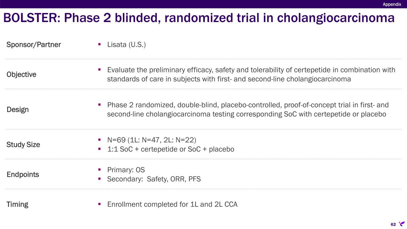 Sponsor/Partner  Lisata (U.S.) Objective  Evaluate the preliminary efficacy, safety and tolerability of certepetide in combination with standards of care in subjects with first- and second-line cholangiocarcinoma Design  Phase 2 randomized, double-blind, placebo-controlled, proof-of-concept trial in first- and second-line cholangiocarcinoma testing corresponding SoC with certepetide or placebo Study Size  N=69 (1L: N=47, 2L: N=22)  1:1 SoC + certepetide or SoC + placebo Endpoints  Primary: OS  Secondary: Safety, ORR, PFS Timing  Enrollment completed for 1L and 2L CCA BOLSTER: Phase 2 blinded, randomized trial in cholangiocarcinoma Appendix 62