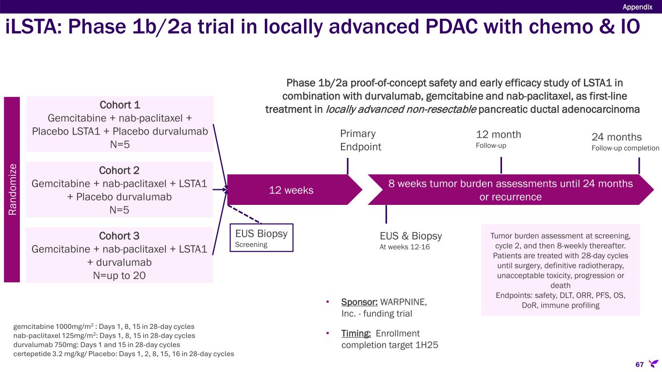 Sponsor/Partner  WARPNINE, Inc. (registered charity in Australia) is funding trial  Lisata providing study drug Objective  Evaluate safety and therapeutic effect of LSTA1 in combination with IO & Chemo in locally advanced non-resectable pancreatic ductal adenocarcinoma (PDAC); determine if inoperable tumors can become operable Design  Phase 1b/2a proof-of-concept safety and early efficacy study of LSTA1 in combination with durvalumab, gemcitabine and nab-paclitaxel, as first-line treatment in locally advanced non-resectable pancreatic adenocarcinoma Study Size  N=30 Endpoints  Safety and tolerability; 28-day DLTs  Objective response rate, PFS, OS, duration of response, immune cell infiltration Timing  Enrollment completion target 1H25 Appendix 66 iLSTA: Phase 1b/2a trial in locally advanced PDAC with chemo & IO