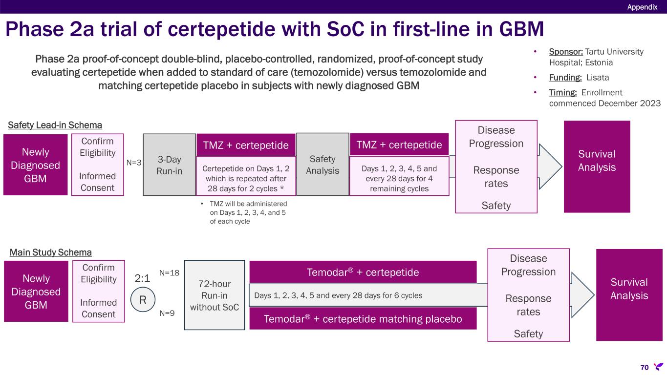 Sponsor/Partner  Tartu University Hospital (Investigator initiated trial in Estonia, Latvia and Lithuania)  Lisata providing study drug and funding trial Objective  Evaluate safety, tolerability, and therapeutic effect of certepetide in combination with standard-of-care (temozolomide) in patients with previously untreated Glioblastoma Multiforme Design  Phase 2a proof-of-concept, double-blind, placebo-controlled, randomized study evaluating certepetide when added to standard of care (temozolomide) versus SoC and placebo in subjects with newly diagnosed Glioblastoma Multiforme (GBM) Study Size  N=30 total (N=3 safety run-in, N=18 in main study schema) Endpoints  Safety, tolerability  ORR, PFS, OS, disease control rate Timing  Enrollment commenced December 2023 Appendix 69 Phase 2a trial of certepetide with SoC in first-line GBM