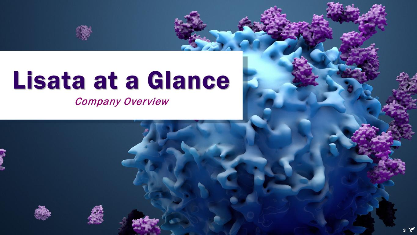 2 Forward-looking statements advisory This presentation contains “forward-looking statements” that involve substantial risks and uncertainties for purposes of the safe harbor provided by the Private Securities Litigation Reform Act of 1995. All statements, other than statements of historical facts, included in this communication regarding strategy, future operations, future financial position, future revenue, projected expenses, prospects, plans and objectives of management are forward-looking statements. In addition, when or if used in this communication, the words “may,” “could,” “should,” “anticipate,” “believe,” “estimate,” “expect,” “intend,” “plan,” “predict”, “target” and similar expressions and their variants, as they relate to Lisata or its management, may identify forward-looking statements. Examples of forward-looking statements include, but are not limited to, statements relating to Lisata’s continued listing on the Nasdaq Capital Market; expectations regarding the capitalization, resources and ownership structure of Lisata; the approach Lisata is taking to discover, develop and commercialize novel therapeutics; the adequacy of Lisata’s capital to support its future operations and its ability to successfully initiate and complete clinical trials; and the difficulty in predicting the time and cost of development of Lisata’s product candidates. Actual results could differ materially from those contained in any forward-looking statement as a result of various factors, including, without limitation: the safety and efficacy of Lisata’s product candidates, decisions of regulatory authorities and the timing thereof, the duration and impact of regulatory delays in Lisata’s clinical programs, Lisata’s ability to finance its operations, the likelihood and timing of the receipt of future milestone and licensing fees, the future success of Lisata’s scientific studies, Lisata’s ability to successfully develop and commercialize drug candidates, the timing for starting and completing clinical trials, rapid technological change in Lisata’s markets, the ability of Lisata to protect its intellectual property rights and legislative, regulatory, political and economic developments. The foregoing review of important factors that could cause actual events to differ from expectations should not be construed as exhaustive and should be read in conjunction with statements that are included herein and elsewhere, including the risk factors included in Lisata’s Annual Report on Form 10-K filed with the SEC on February 27, 2025, and in other documents filed by Lisata with the Securities and Exchange Commission. Except as required by applicable law, Lisata undertakes no obligation to revise or update any forward-looking statement, or to make any other forward-looking statements, whether as a result of new information, future events or otherwise. Disclosure