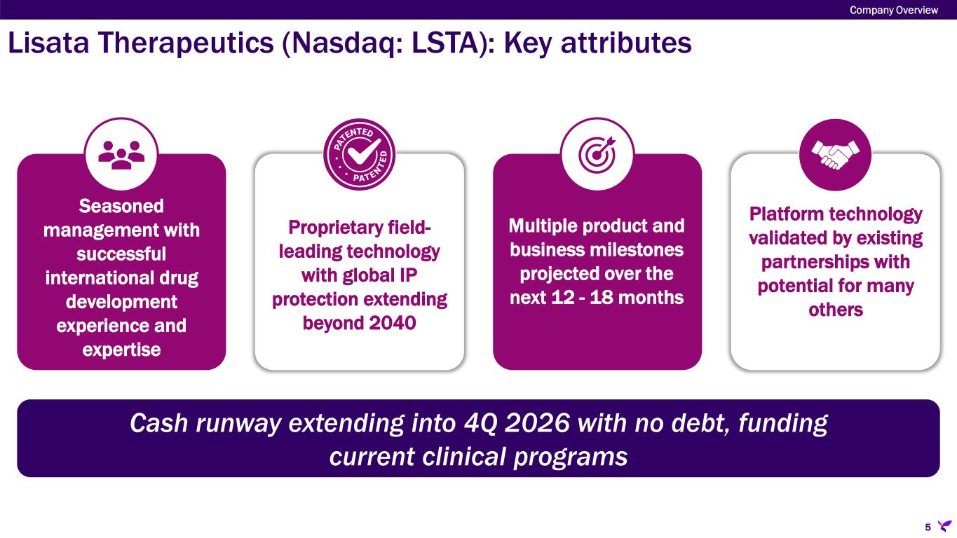 Lisata Therapeutics (Nasdaq: LSTA) Company Overview 4 OVERVIEW Clinical-stage therapeutics company rapidly developing a novel solid tumor targeting and penetration technology with tumor microenvironment (TME) modifying properties. MISSION To safely enhance the treatment benefits of existing and emerging therapies for solid tumors and similar diseases utilizing an approach that is patient-friendly and pharmacoeconomically attractive.