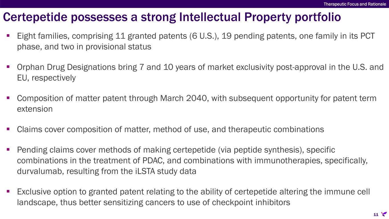 Certepetide is designed to optimize solid tumor treatment 1 Sugahara, et al. Mol Cancer Ther; 14(1) January 2015; Hamilton, et al., J MolMed. April 2015; and Miyamura, et al., bioRxiv. May 2023. 2 Yuan, D., Duda, D., et al. CCA Foundation Conf. 2024 Poster. Enhancing the efficacy of standard therapy in intrahepatic cholangiocarcinoma using LSTA1, a novel tumor targeting and penetration agent.  Converts tumor stroma from a barrier to a conduit for anti-cancer drugs  Selectively reduces TME immunosuppressive T cells and recruits cytotoxic T cells(1)  Inhibits the metastatic cascade(2)  Applicable with any modality of anti-cancer therapeutic  Via co-administration or molecular tethering  Poised for Phase 3 in mPDAC **  In mid-stage clinical development in multiple solid tumors Certepetide: a proprietary internalizing RGD* (iRGD) cyclic peptide adjuvant with tumor specific targeting & penetration activity and tumor microenvironment modifying properties *internalizing RGD (iRGD): Arginylglycylaspartic acid **mPDAC: metastatic pancreatic ductal adenocarcinoma 10 Therapeutic Focus and Rationale
