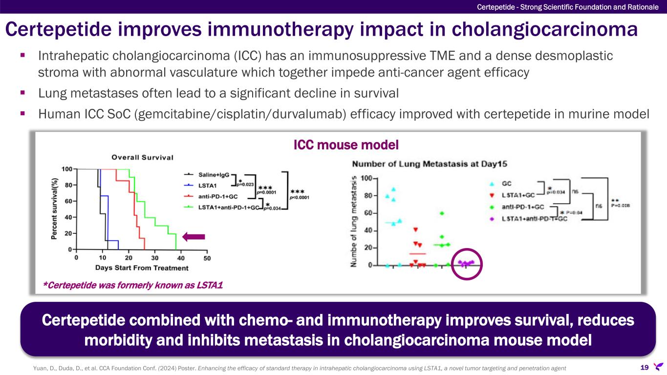 Certepetide/iRGD consistently improves immunotherapy efficacy in multiple preclinical solid tumor models 18 Solid Tumor Types  Intrahepatic cholangiocarcinoma  Pancreatic adenocarcinoma  Prostate cancer  Breast cancer  Non-Small Cell Lung Cancer  Gastric cancer  Hepatocellular carcinoma Preclinical Observations  Improved overall survival  Reduced tumor size  Reduced and/or inhibited metastases Certepetide - Strong Scientific Foundation Sugahara, K., et al. bioRxiv 2023.05.24.542137; doi: https://doi.org/10.1101/2023.05.24.542137 Yuan, D., Duda, D., et al. 2024 CCA Foundation Conference. Poster: Enhancing the efficacy of standard therapy in intrahepatic cholangiocarcinoma using LSTA1, a novel tumor targeting and penetration agent. Sugahara, et al. 2015; Sugahara, et al. 2010 Yang, et al. 2019a; Yang, et al. 2019b Zhang et al 2016b Dong, et al. 2023 AACR 2025 Abstracts: • Kim, M., Sugahara, K., et al. iRGD peptide therapy transforms immunosuppressive microenvironment to immune-favorable state in pancreatic ductal adenocarcinoma (https://www.abstractsonline.com/pp8/#!/20273/presentation/5422). • Miyamura, N., Sugahara, K., et al. A cytotoxic peptide designed for tumor-targeted delivery of co-injected molecules (https://www.abstractsonline.com/pp8/#!/20273/presentation/3881). • Kuroda, Y., Sugahara, K., et al. The iRGD tumor-penetrating peptide inhibits TGF-β activation mediated by an αvβ5 integrin-rich tumor microenvironment in pancreatic cancer (https://www.abstractsonline.com/pp8/#!/20273/presentation/5404). • Choi, Y., Sugahara, K., et al. Altered collagen morphology in pancreatic cancer treated with the iRGD tumor-penetrating peptide (https://www.abstractsonline.com/pp8/#!/20273/presentation/5419).