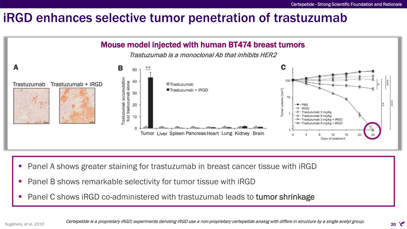iRGD enhances selective tumor penetration of trastuzumab Mouse model injected with human BT474 breast tumors  Panel A shows greater staining for trastuzumab in breast cancer tissue with iRGD  Panel B shows remarkable selectivity for tumor tissue with iRGD  Panel C shows iRGD co-administered with trastuzumab leads to tumor shrinkage Sugahara, et al. 2010 Certepetide - Strong Scientific Foundation and Rationale 20 Trastuzumab + iRGDTrastuzumab A CB Tumor Liver Spleen HeartPancreas Lung Kidney Brain Certepetide is a proprietary iRGD; experiments denoting iRGD use a non-proprietary certepetide analog with differs in structure by a single acetyl group. Trastuzumab is a monoclonal Ab that inhibits HER2