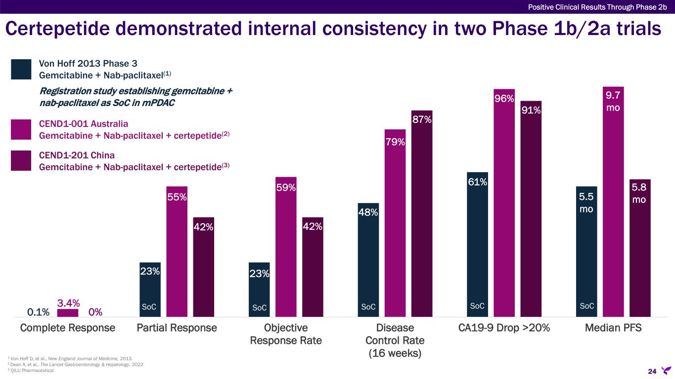 23 Positive Clinical Results Through Phase 2b Certepetide improved survival in mPDAC in two independent, multicenter Phase 1b/2a trials 1 Von Hoff D, et al., New England Journal of Medicine, 2013. 2 Dean A, et al., The Lancet Gastroenterology & Hepatology, 2022 3 QILU Pharmaceutical 0.5 2.5 4.5 6.5 8.5 10.5 12.5 Median Overall Survival (Months) M on th s 13.2 months 8.5 months 11.1 months 55% improvement SoC + certepetide 31% improvement SoC CEND1-201 China Gemcitabine + Nab-paclitaxel + certepetide(3) Von Hoff 2013 Phase 3 Gemcitabine + Nab-paclitaxel(1) Registration study establishing gemcitabine + nab-paclitaxel as SoC in mPDAC CEND1-001 Australia Gemcitabine + Nab-paclitaxel + certepetide(2)