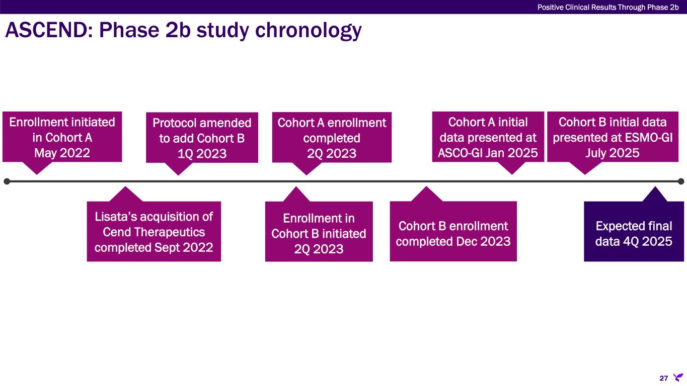 ASCEND: Phase 2b study of certepetide in mPDAC  Sponsor: Australasian Gastro-Intestinal Trials Group (AGITG) and NHMRC Clinical Trials Centre of University of Sydney (Australia) • Lisata-funded, data contractually sponsor- controlled • Restricts initial public announcement of results to scientific meetings or publications  ‘Academic design’ overlooked global regulatory standards supporting eventual approval • Powered for 6-mos. PFS primary endpoint • Not a standard regulatory endpoint • Single cohort with one IV push of certepetide 3.2 mg/kg + SoC vs. SoC alone Investigator initiated trial inherited through acquisition of Cend Therapeutics Lisata amended protocol to ensure trial data will support global registration strategy  Lisata clinical trial data rights defined/expanded  ‘Product development design’ considers eventual regulatory review and approval  Median overall survival (precedent registration endpoint) added for both cohorts  Second cohort (Cohort B) added with two IV pushes of certepetide 3.2 mg/kg administered 4 hours apart to further evaluate pharmacodynamics of certepetide consistent with FDA Project Optimus 26 Positive Clinical Results Through Phase 2b