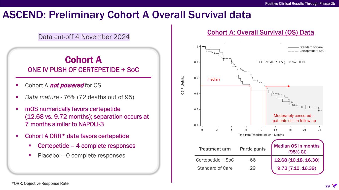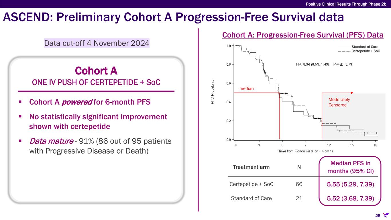 ASCEND: Preliminary Cohort A Progression-Free Survival data Cohort A ONE IV PUSH OF CERTEPETIDE + SoC  Cohort A powered for 6-month PFS  No statistically significant improvement shown with certepetide  Data mature - 91% (86 out of 95 patients with Progressive Disease or Death) Cohort A: Progression-Free Survival (PFS) Data Treatment arm N Median PFS in months (95% CI) Certepetide + SoC 66 5.55 (5.29, 7.39) Standard of Care 21 5.52 (3.68, 7.39) median Moderately Censored Certepetide + SoC Standard of Care 28 Data cut-off 4 November 2024 Positive Clinical Results Through Phase 2b