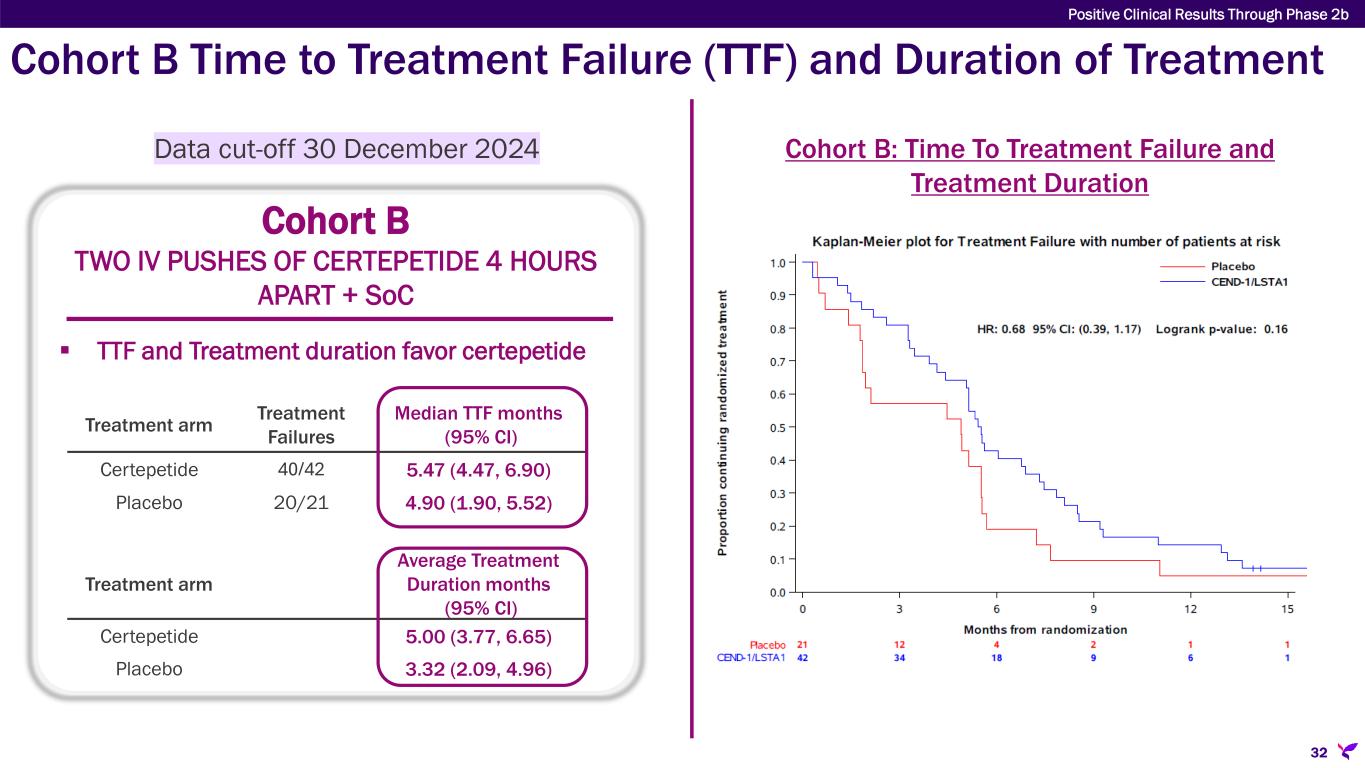Cohort B Time to Treatment Failure (TTF) and Duration of Treatment Cohort B TWO IV PUSHES OF CERTEPETIDE 4 HOURS APART + SoC Cohort B: Time To Treatment Failure and Treatment Duration Treatment arm Treatment Failures Median TTF months (95% CI) Certepetide 40/42 5.47 (4.47, 6.90) Placebo 20/21 4.90 (1.90, 5.52) Data cut-off 30 December 2024 Treatment arm Average Treatment Duration months (95% CI) Certepetide 5.00 (3.77, 6.65) Placebo 3.32 (2.09, 4.96)  TTF and Treatment duration favor certepetide Positive Clinical Results Through Phase 2b 32