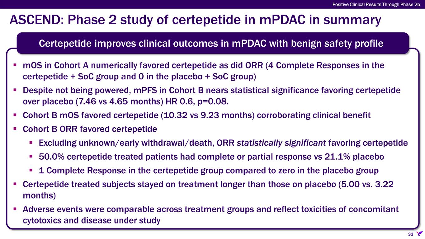 ASCEND: Preliminary Cohort B Overall Survival data Cohort B TWO IV PUSHES OF CERTEPETIDE 4 HOURS APART + SoC  Cohort B not powered for OS  Data mature - 71% (45 deaths out of 63)  mOS favors certepetide (10.32 vs. 9.23 months)  Separation occurs at 7 months similar to NAPOLI-3 NALIRIFOX Phase 3 study data  Cohort B ORR favors certepetide (see next slide)  (CR + PR) 45% vs 19% certepetide vs placebo; 1 CR certepetide, 0 CR placebo group Cohort B: Overall Survival (OS) Data Treatment arm Participants Median OS in months (95% CI) Certepetide 42 10.32 (8.87, 13.14) Placebo 21 9.23 (6.24, 15.01) Data cut-off 30 December 2024 Positive Clinical Results Through Phase 2b 31