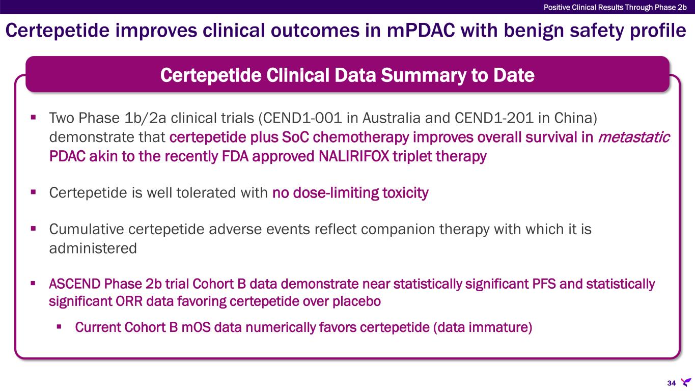 ASCEND: Phase 2 study of certepetide in mPDAC in summary  mOS in Cohort A numerically favored certepetide as did ORR (4 Complete Responses in the certepetide + SoC group and 0 in the placebo + SoC group)  Despite not being powered, mPFS in Cohort B nears statistical significance favoring certepetide over placebo (7.46 vs 4.65 months) HR 0.6, p=0.08.  Cohort B mOS favored certepetide (10.32 vs 9.23 months) corroborating clinical benefit  Cohort B ORR favored certepetide  Excluding unknown/early withdrawal/death, ORR statistically significant favoring certepetide  50.0% certepetide treated patients had complete or partial response vs 21.1% placebo  1 Complete Response in the certepetide group compared to zero in the placebo group  Certepetide treated subjects stayed on treatment longer than those on placebo (5.00 vs. 3.22 months)  Adverse events were comparable across treatment groups and reflect toxicities of concomitant cytotoxics and disease under study Certepetide improves clinical outcomes in mPDAC with benign safety profile Positive Clinical Results Through Phase 2b 33