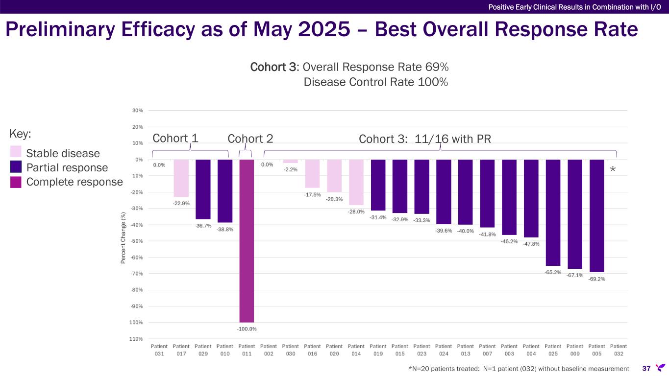 Preliminary Efficacy as of May 2025 – Best Overall Response Rate *N=20 patients treated: N=1 patient (032) without baseline measurement Cohort 3: 11/16 with PRKey: Stable disease Partial response Complete response Cohort 1 Cohort 2 * Cohort 3: Overall Response Rate 69% Disease Control Rate 100% Pe rc en t C ha ng e (% ) Positive Early Clinical Results in Combination with I/O 37
