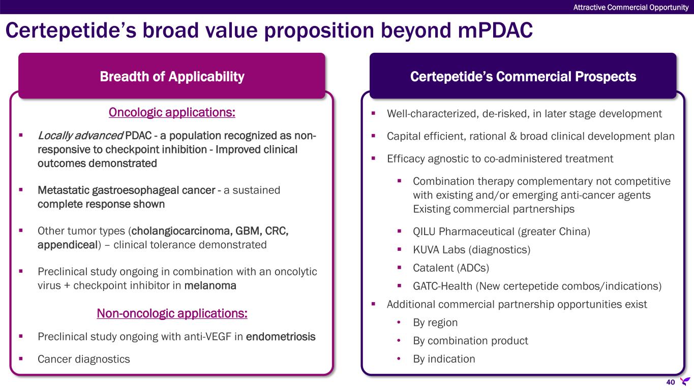 Patient with mPDAC Diagnosis Poor Patient Functional Status Good Patient Functional Status Gemcitabine + Nab-paclitaxel Gemcitabine + Nab-paclitaxel First-Line (1L) First-Line (1L) Disease Progression FOLFIRINOX or NALIRIFOX FOLFIRINOX or FOLFIRI or FOLFOX or NALIRIFOX Second-Line (2L) Second-Line (2L) Immunotherapy or other treatment CERTEPETIDE CERTEPETIDE Immunotherapy or other treatment CERTEPETIDE Third-Line (3L) Third-Line (3L) Certepetide can be used throughout the mPDAC treatment paradigm Attractive Commercial Opportunity Disease Progression 39
